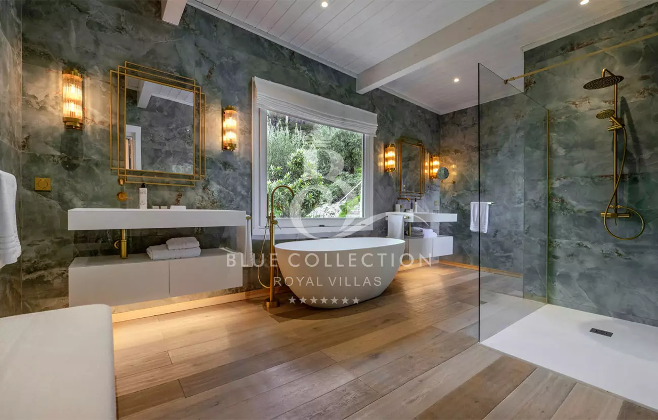 The master suite in the main house features two bathrooms, a private terrace, a dressing area, and a study. Each area offers its own private sitting room, terrace, and kitchen, allowing guests to enjoy ultimate privacy while surrounded by refined style and inviting spaces for entertaining.
