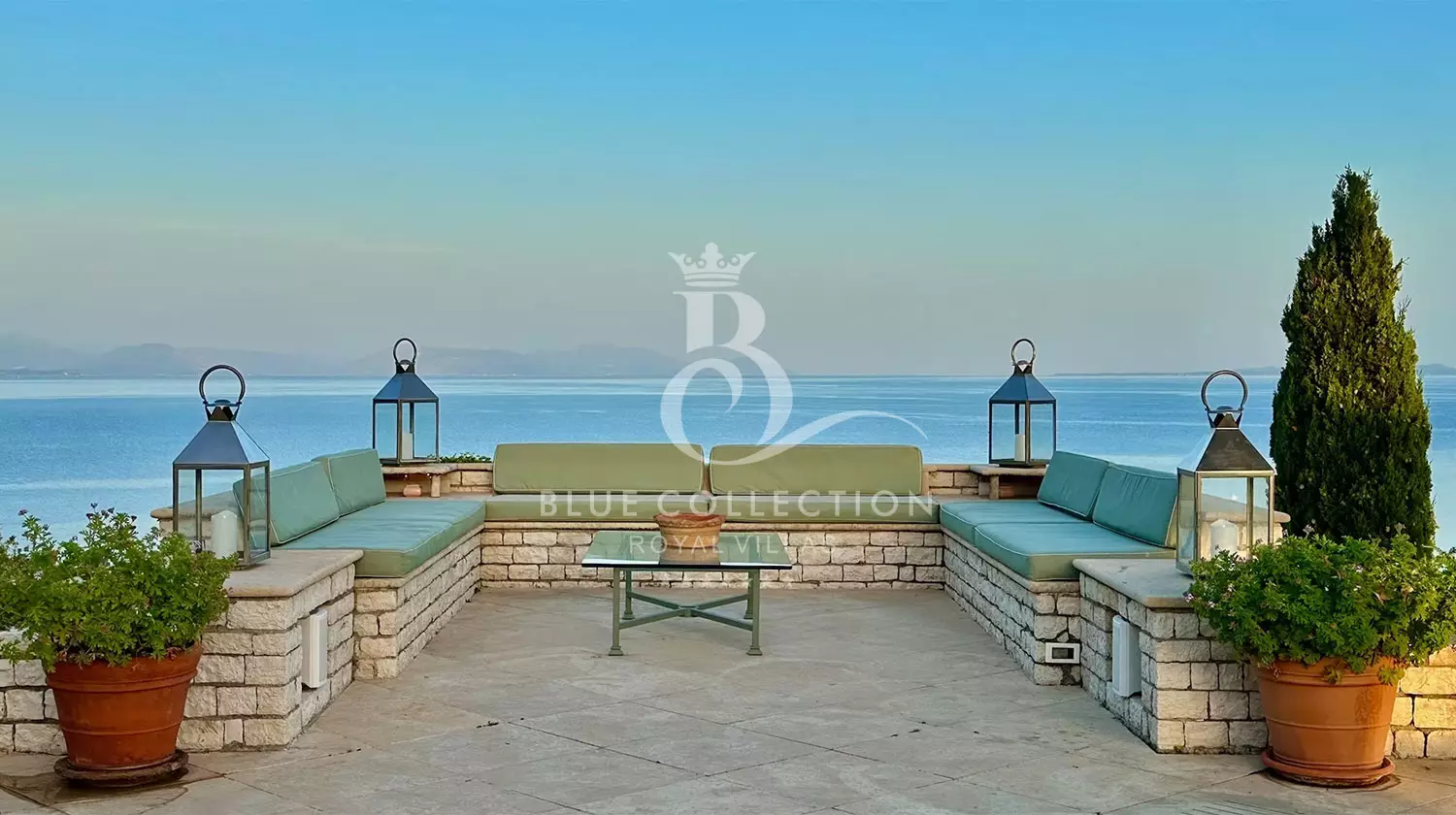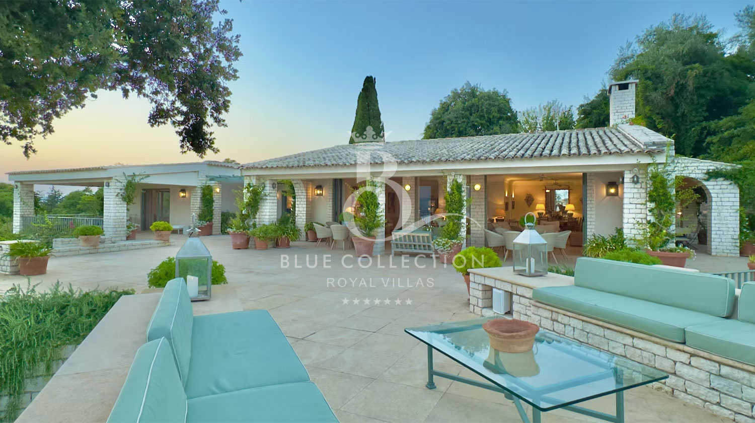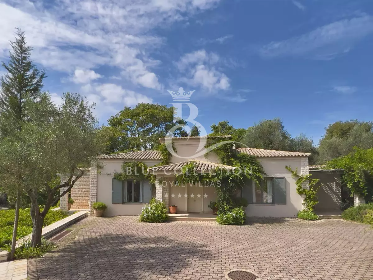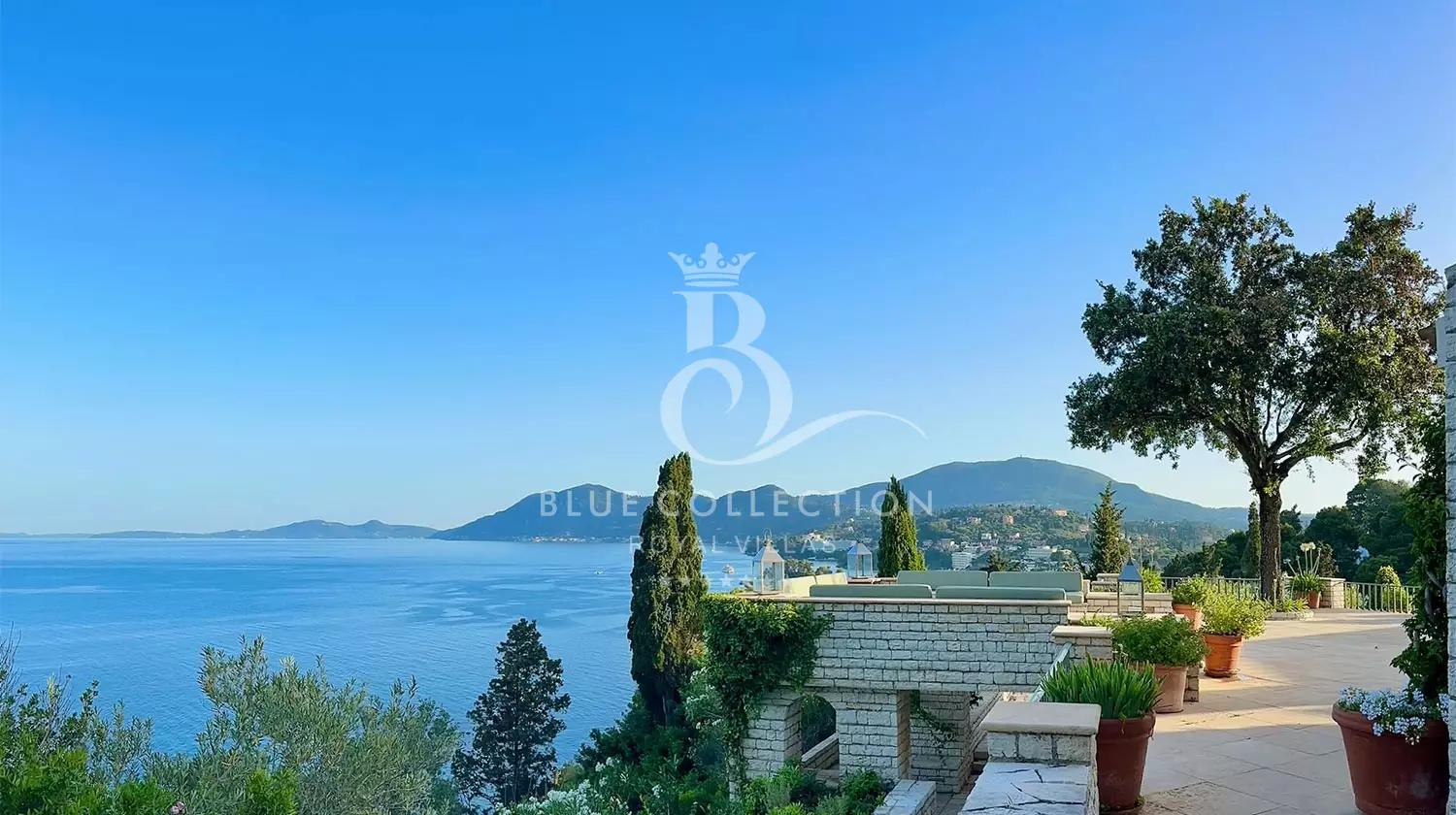 Perched with grace, the estate commands panoramic views of the Ionian Sea and Pontikonissi, the enchanting Mouse Island, casting a spell of tranquility over its visitors.