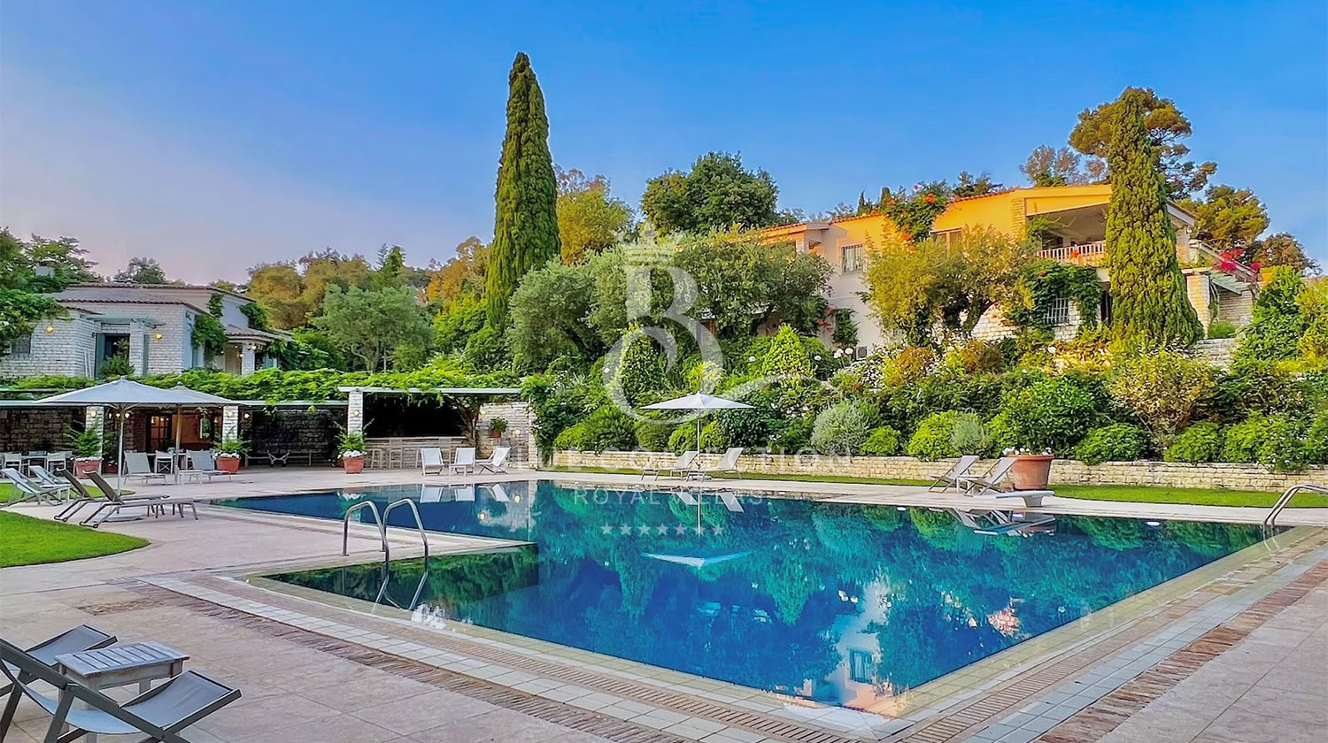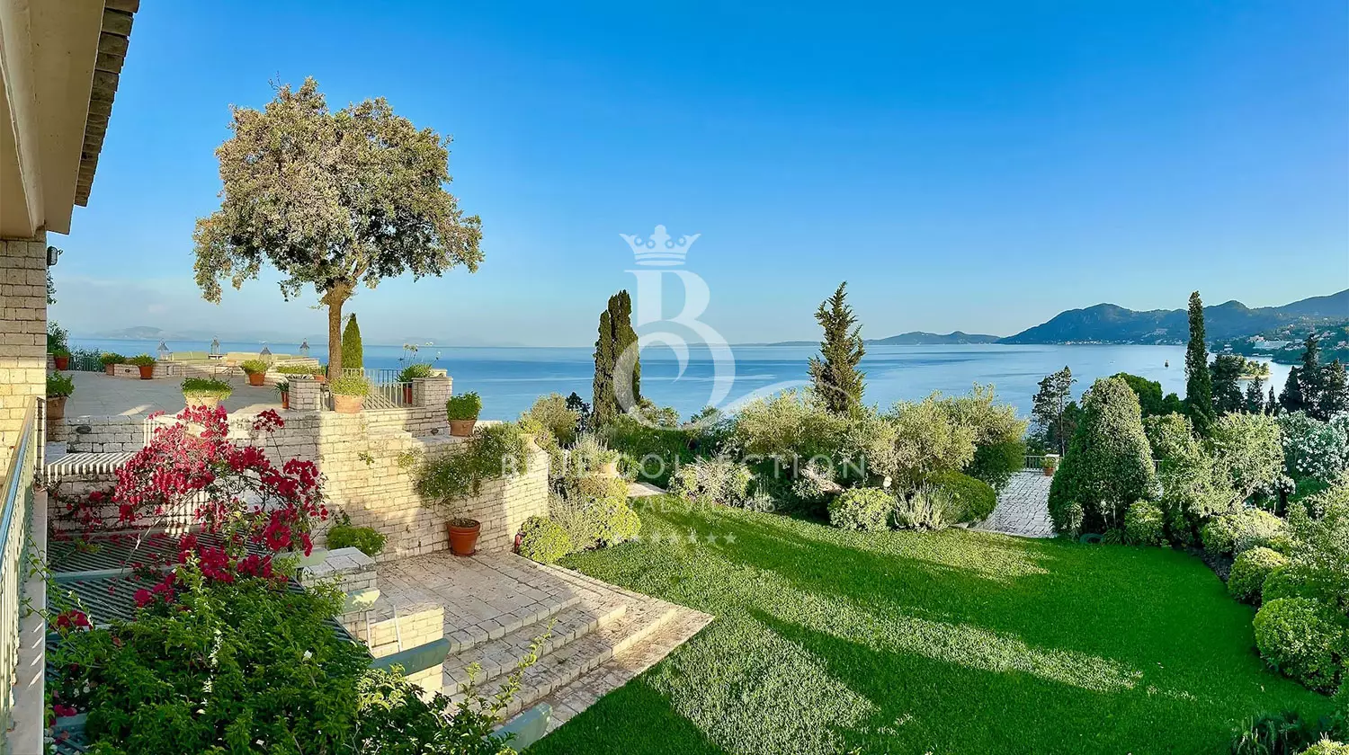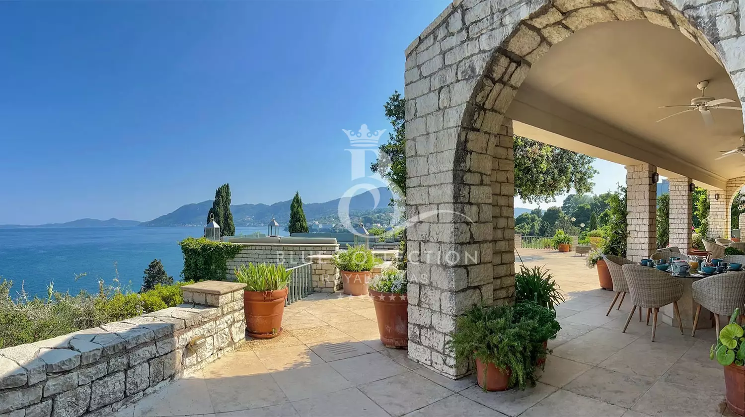 Perched with grace, the estate commands panoramic views of the Ionian Sea and Pontikonissi, the enchanting Mouse Island, casting a spell of tranquility over its visitors.