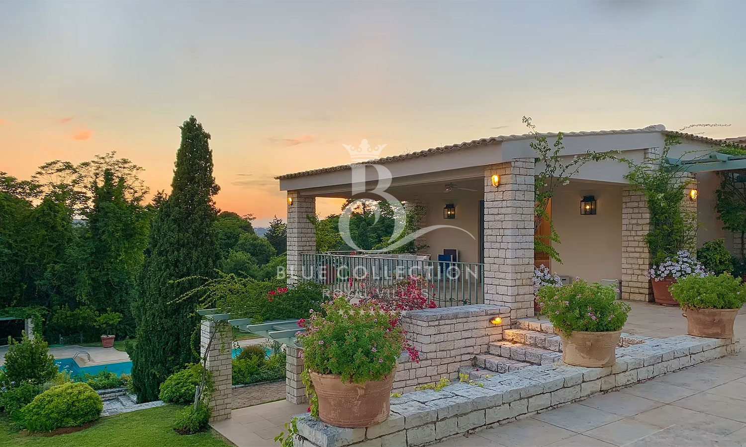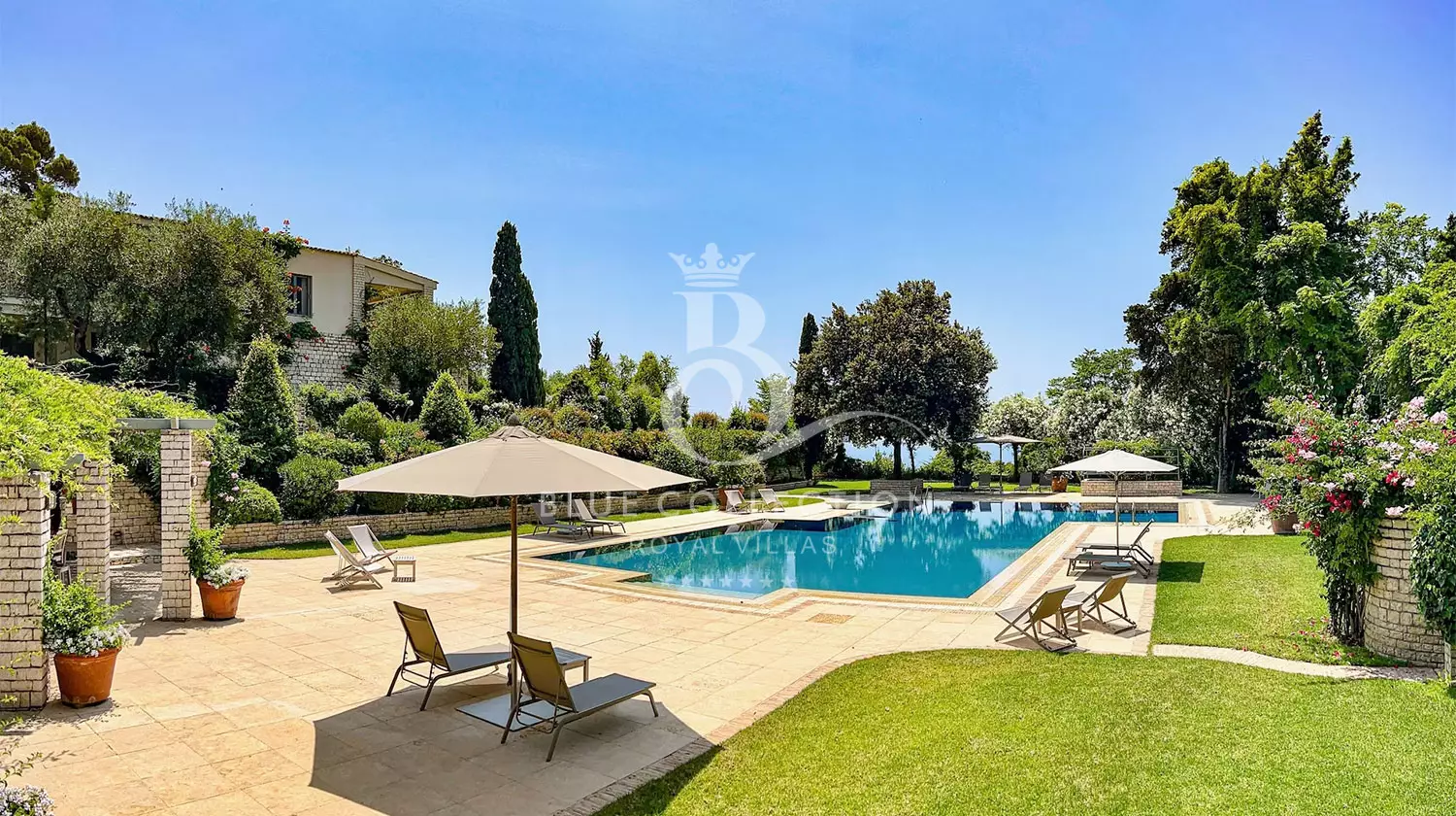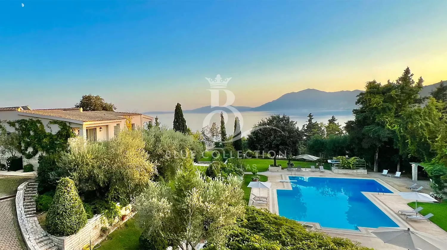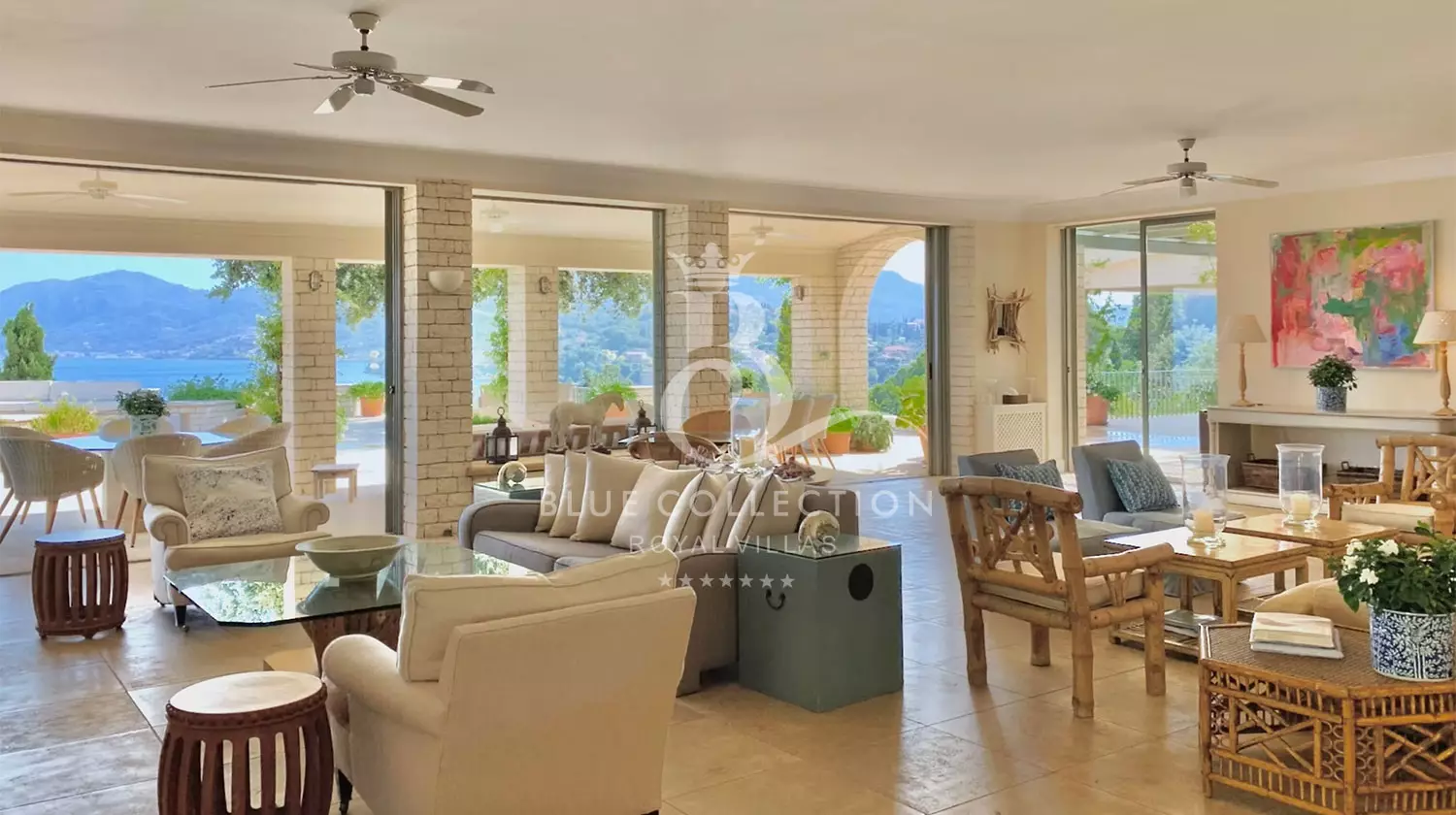 Perched with grace, the estate commands panoramic views of the Ionian Sea and Pontikonissi, the enchanting Mouse Island, casting a spell of tranquility over its visitors.