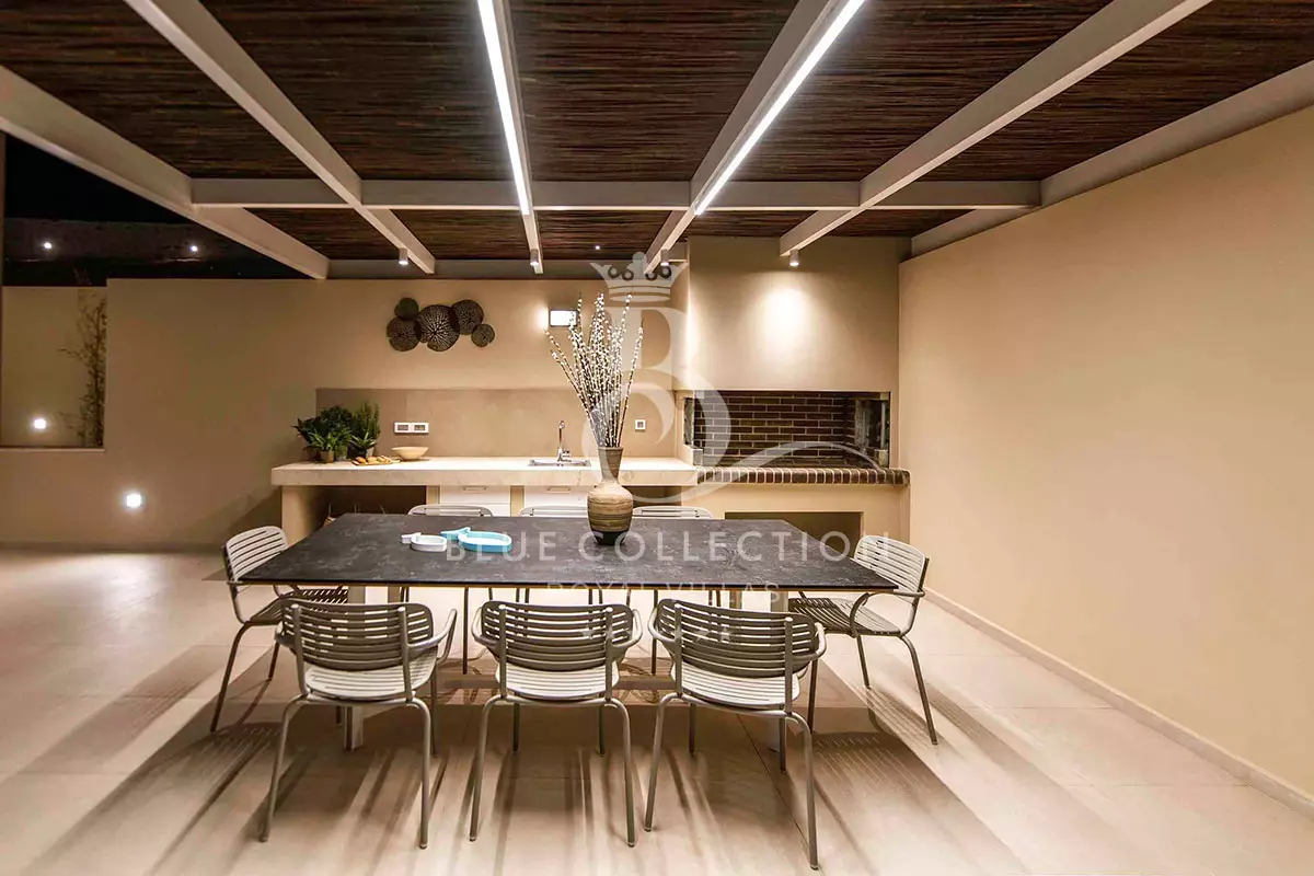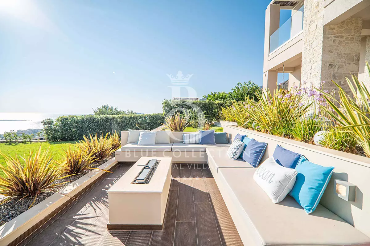 The most dominant feature of the exterior area is a large swimming pool with a secure session for kids to swim and a lounge area with sofas making it the ideal spot to relax while gazing at the gorgeous sunset. Pretty close to this area exists an outdoor dining table under a pergola next to the charcoal barbecue with a sink, cupboards, and preparation area. Next to this area, there are comfortable sunbeds with umbrellas for luxurious poolside relaxation. Spacious verandas and balconies are the best places to spend your time outside enjoying the sea view and fresh air. Don’t forget that a secure parking area is provided outside of the Villa with a charger for the electric cars.