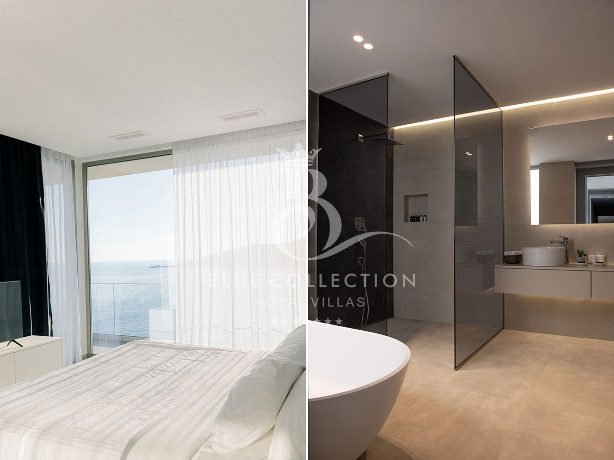• Bedroom 1: king-size bed (1.80×2.00), satellite smart TV, sea view from the balcony, and ensuite bathroom with shower and bathtub