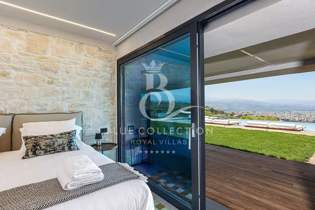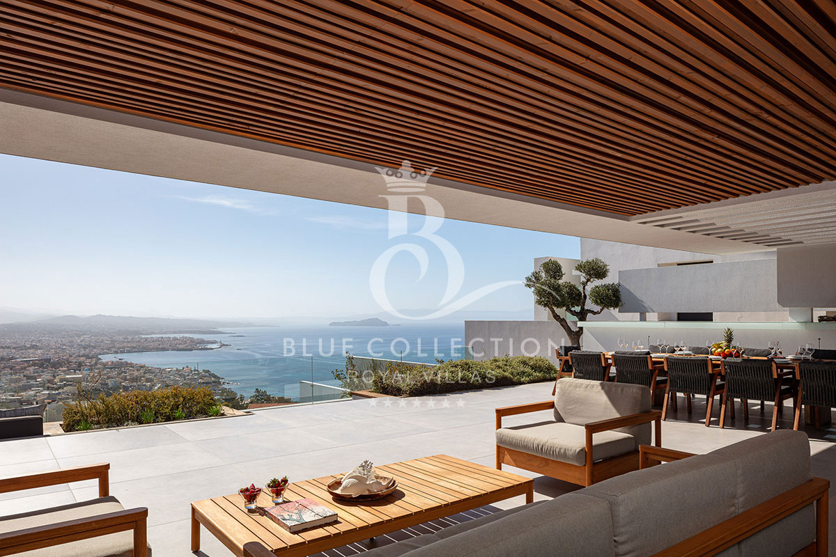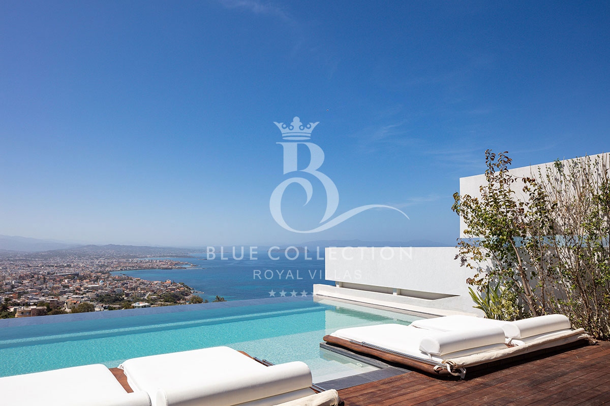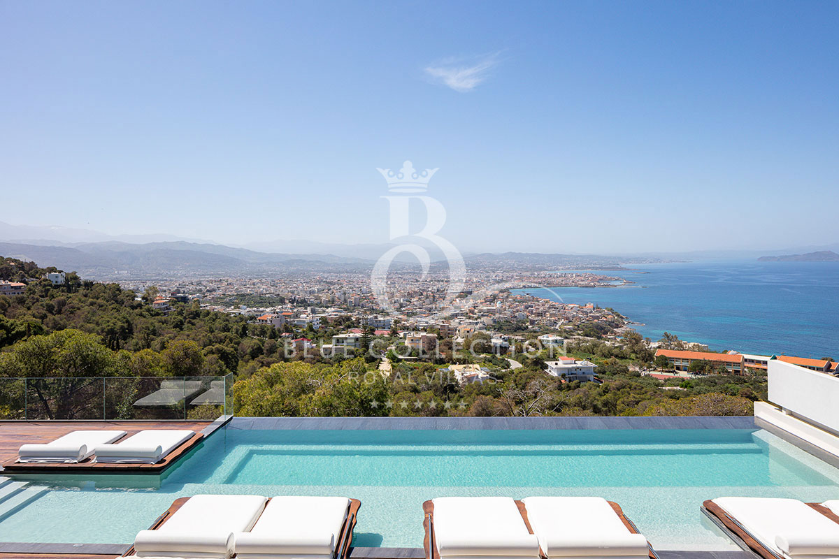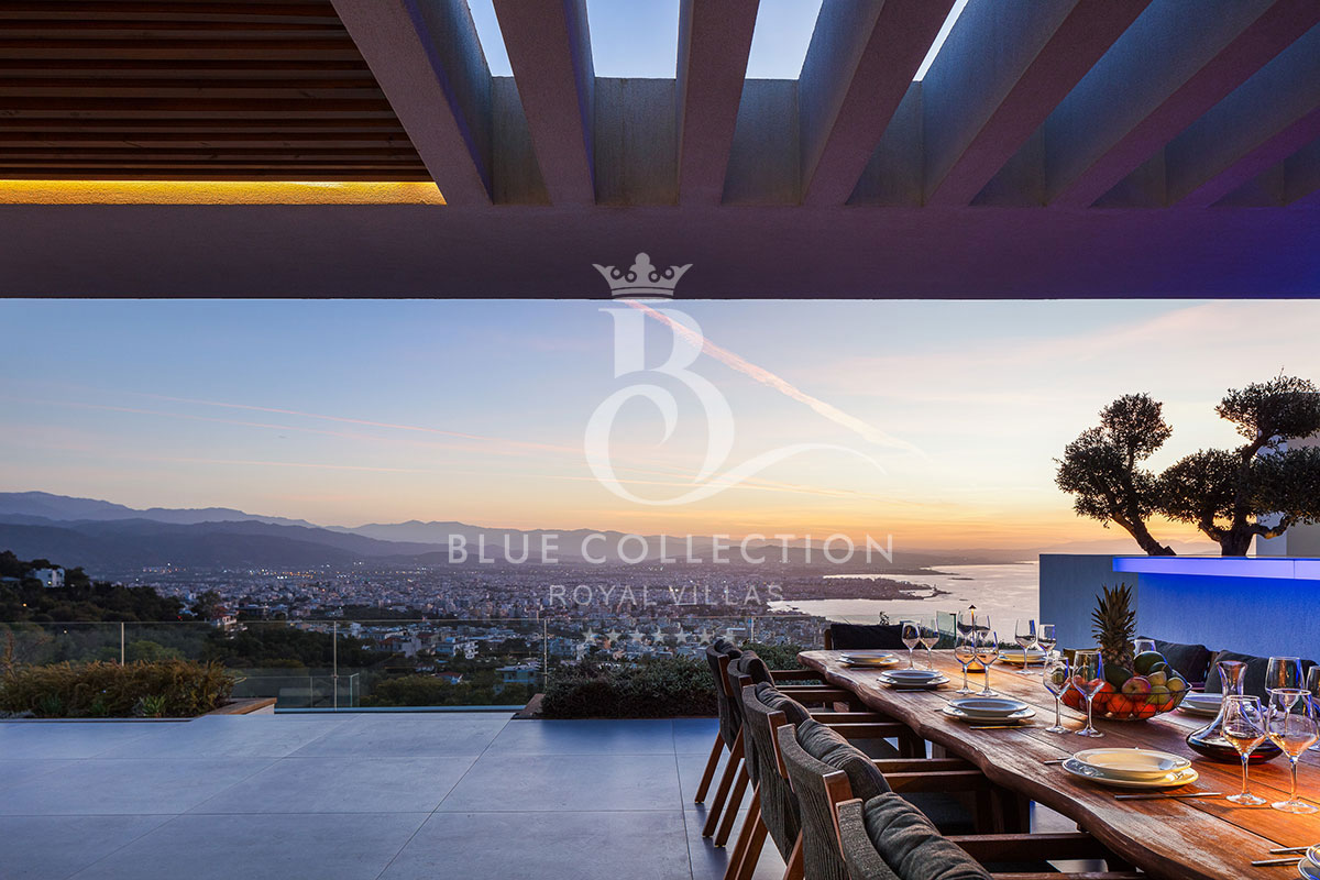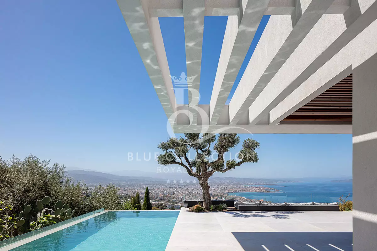 Surrounded by verdant hillside in an exclusive area of Chania in Crete, Villa CRT-34 affords expansive panoramas of Chania city and the Aegean Sea throughout.