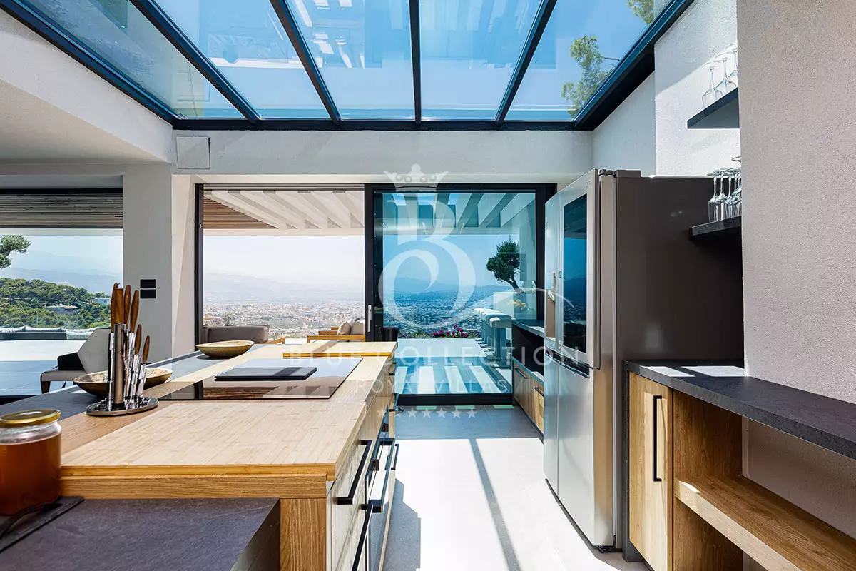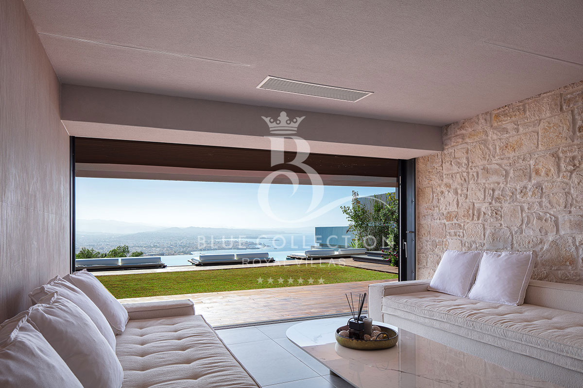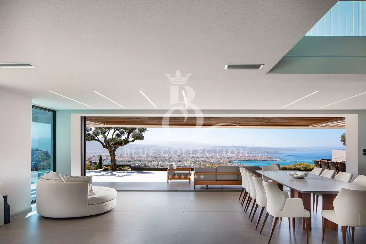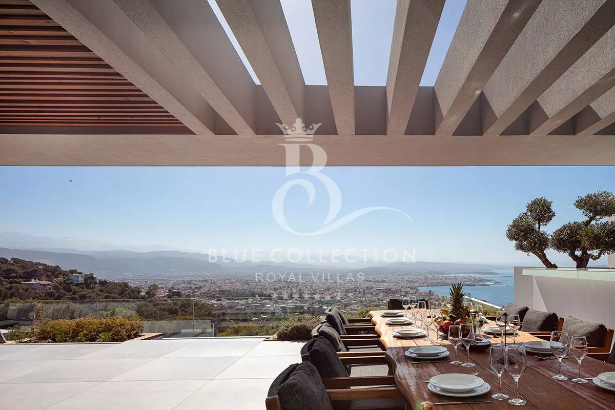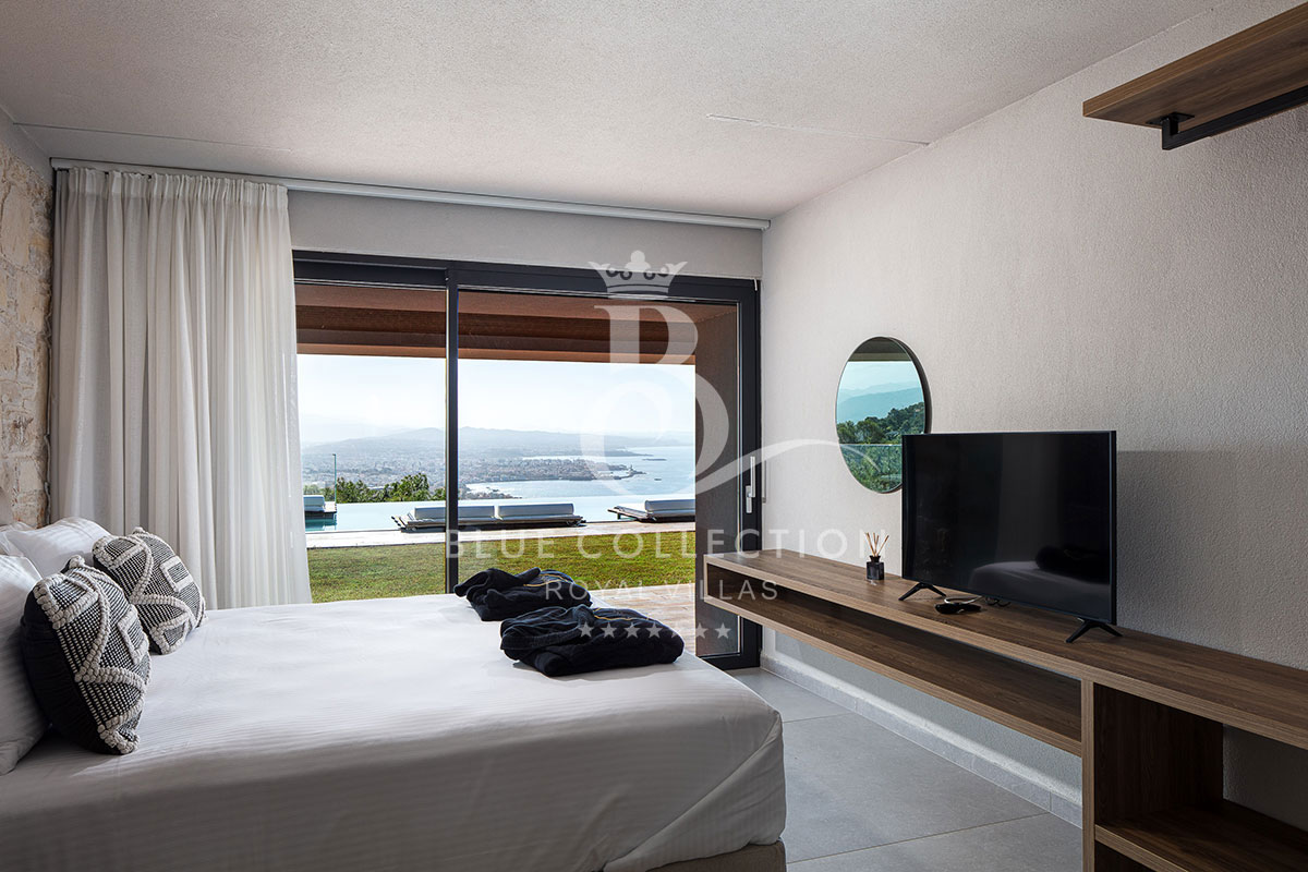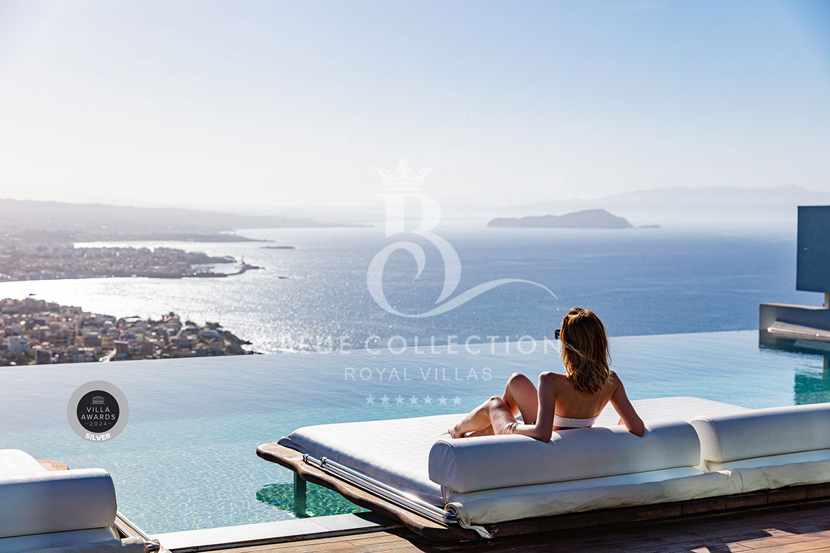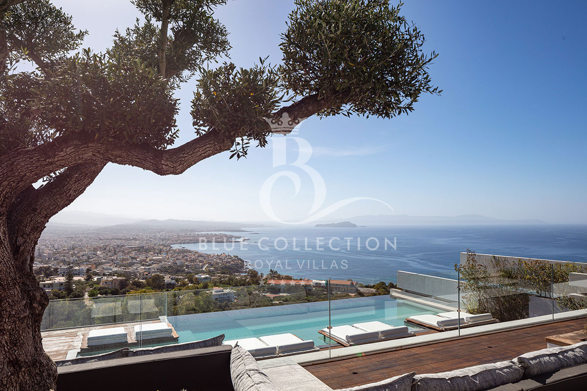 Surrounded by verdant hillside in an exclusive area of Chania in Crete, Villa CRT-34 affords expansive panoramas of Chania city and the Aegean Sea throughout.