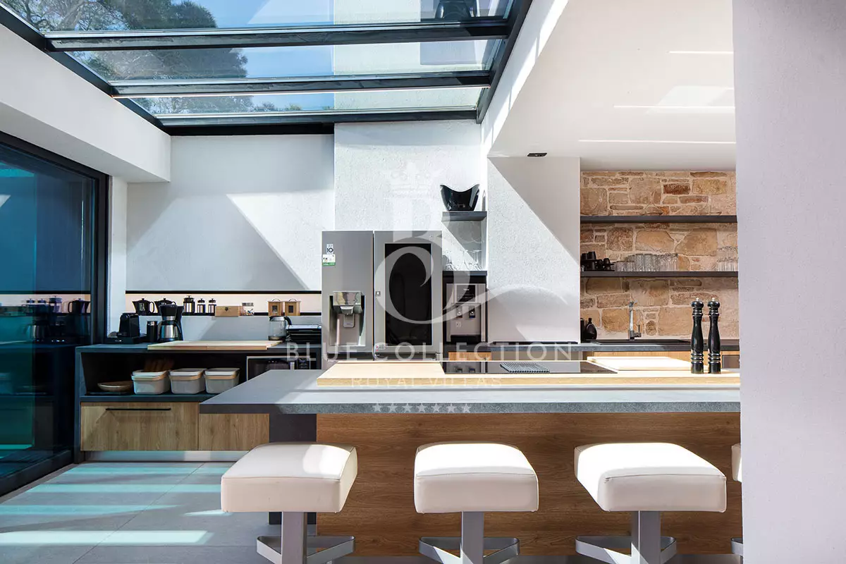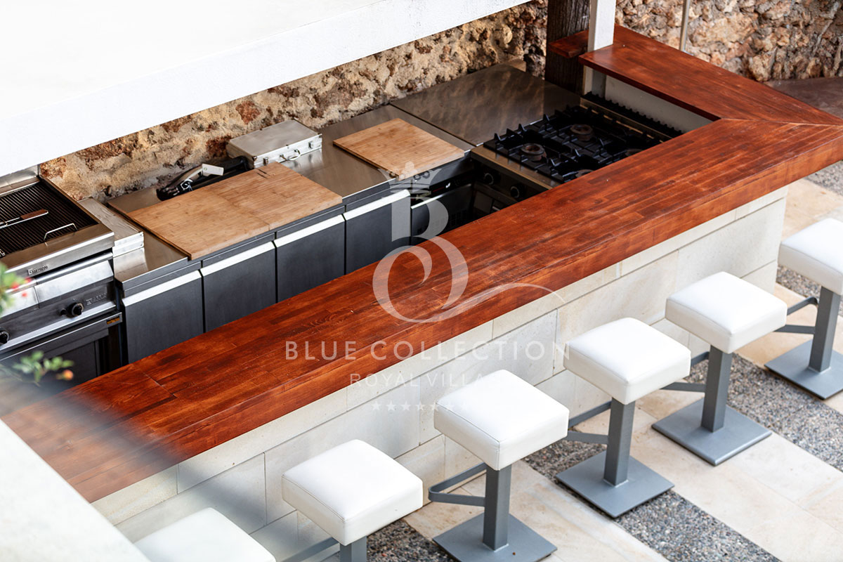 - A bar area is situated just beyond the kitchen, with tall stools capturing the perfect spot to enjoy a refreshing drink under the stars