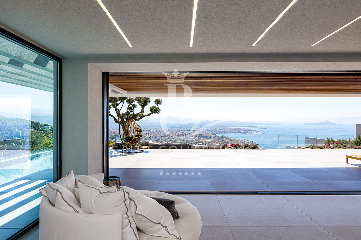 Exquisite outdoor living areas bask within the verdant green forest surrounding the Villa. The interior space with its clean lines and minimalist design takes most of its color from the panoramic windows surrounding the house, capturing the outside sea and city scape.