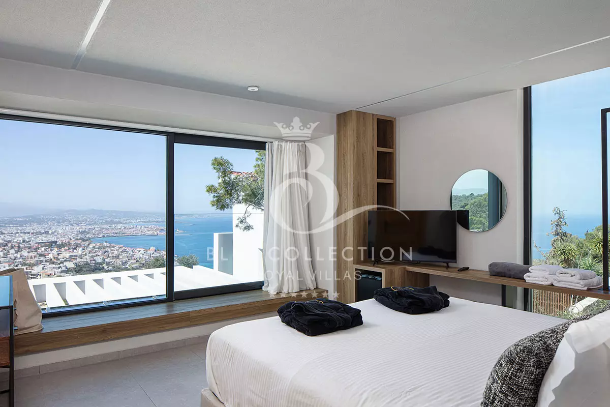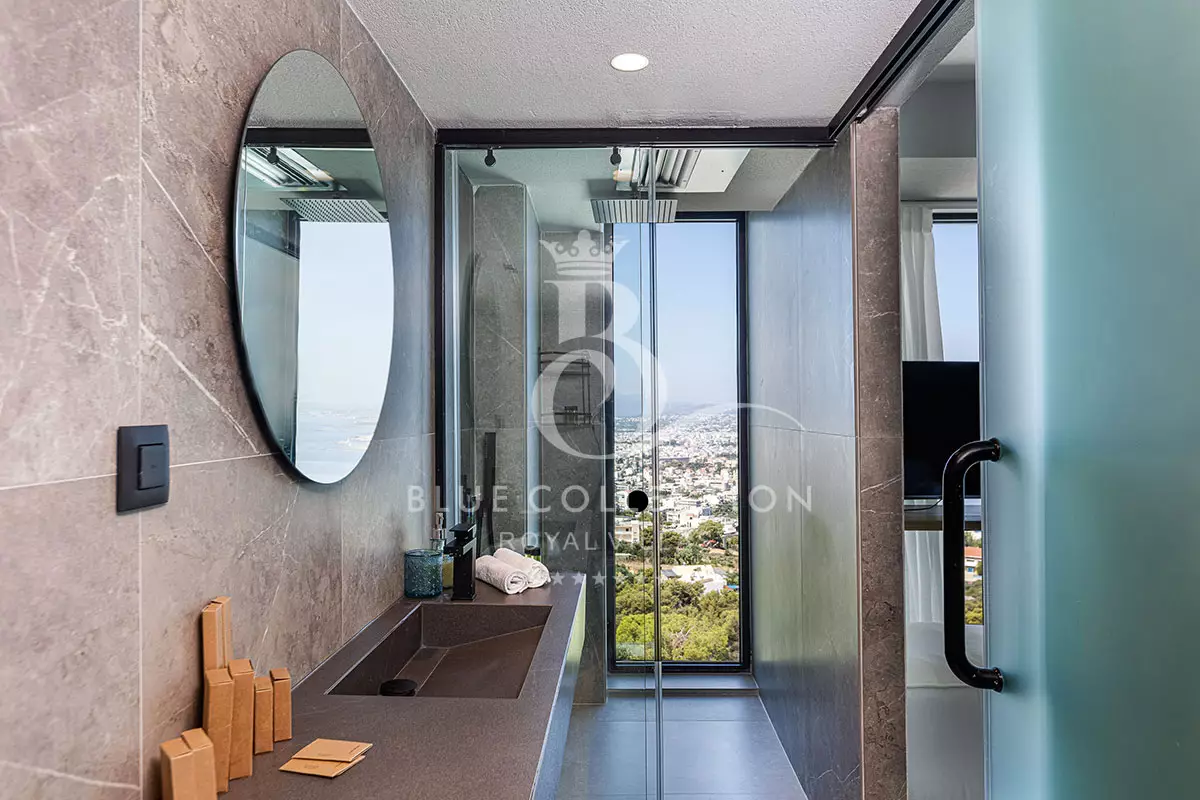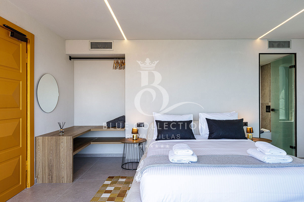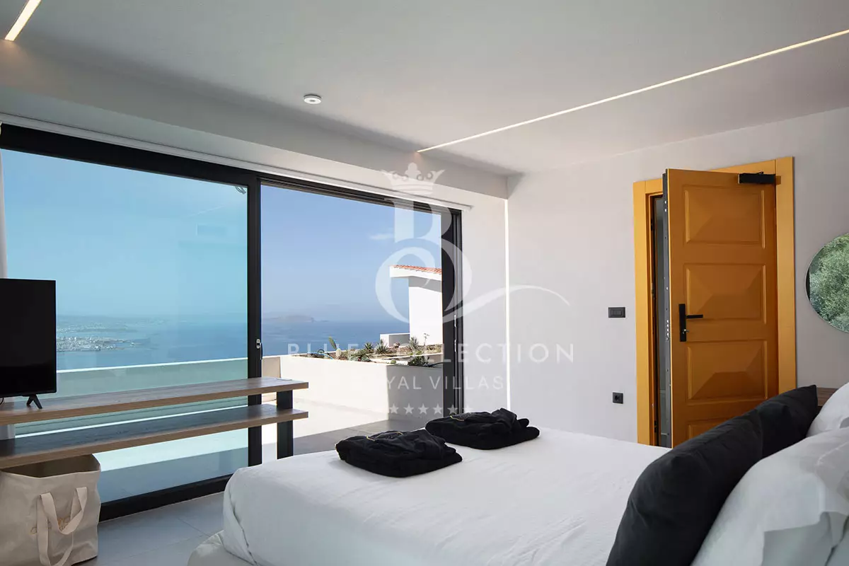 The two modern ensuite bedrooms located on this level fully embrace their privacy with King-size beds (1,80 X 2,00) facing directly out to sea and the surprising glass paneled bathrooms, spoiling you with their view. Both bedrooms have a 42” Smart TV, an open closet and are furnished to a high design standard.