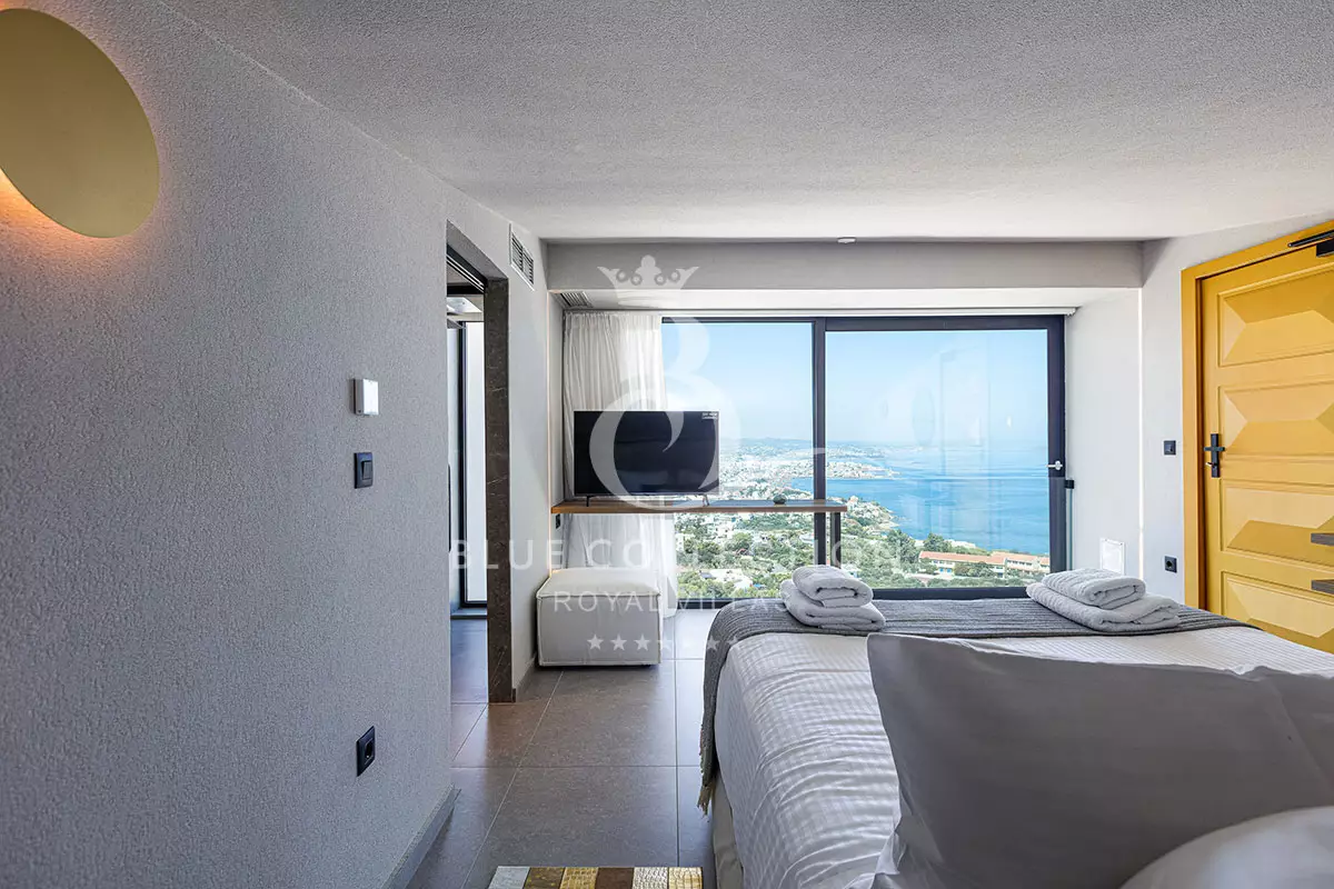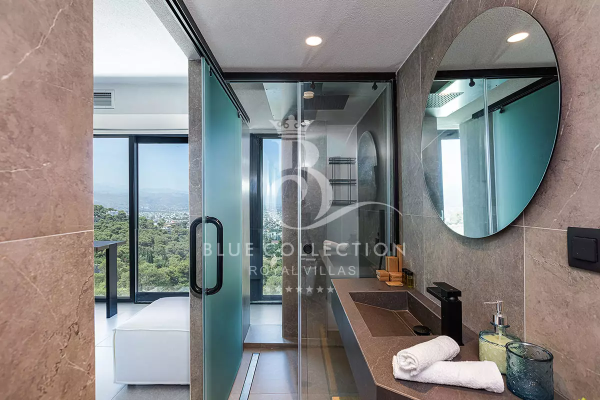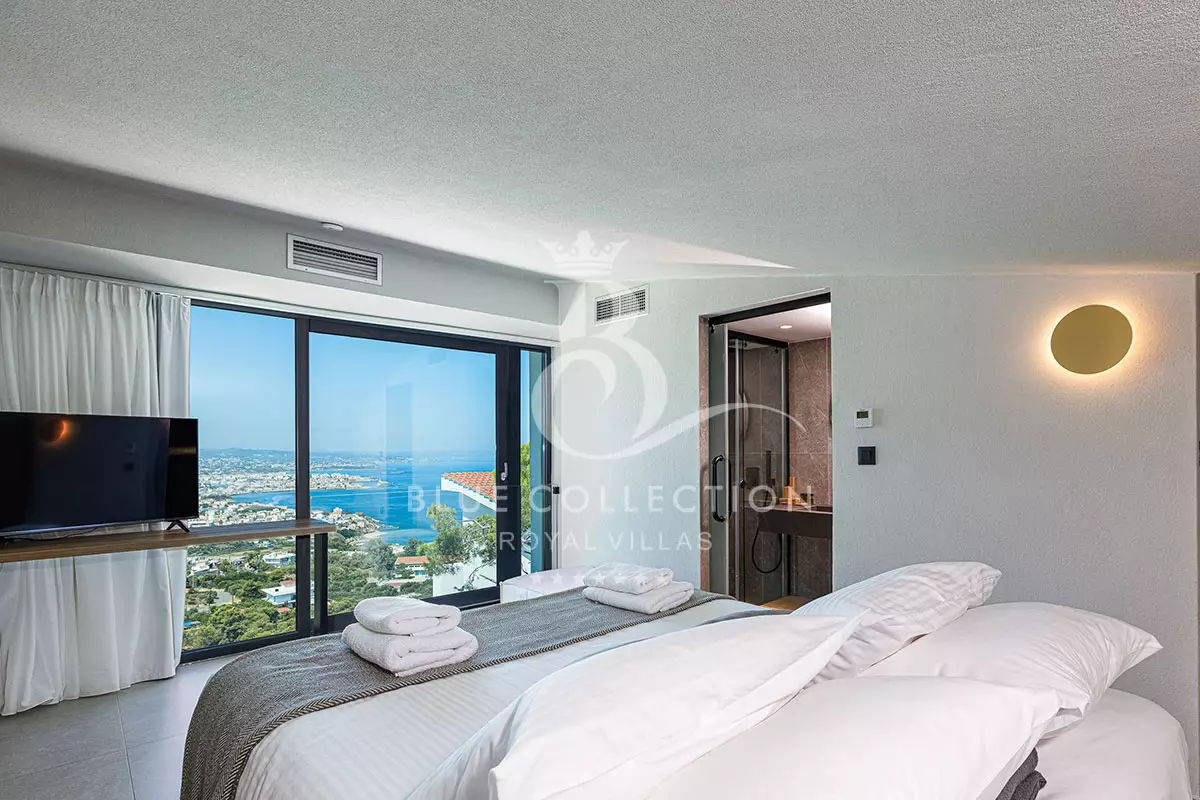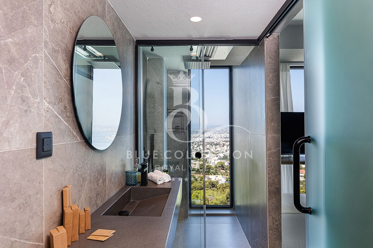 The two modern ensuite bedrooms located on this level fully embrace their privacy with King-size beds (1,80 X 2,00) facing directly out to sea and the surprising glass paneled bathrooms, spoiling you with their view. Both bedrooms have a 42” Smart TV, an open closet and are furnished to a high design standard.
