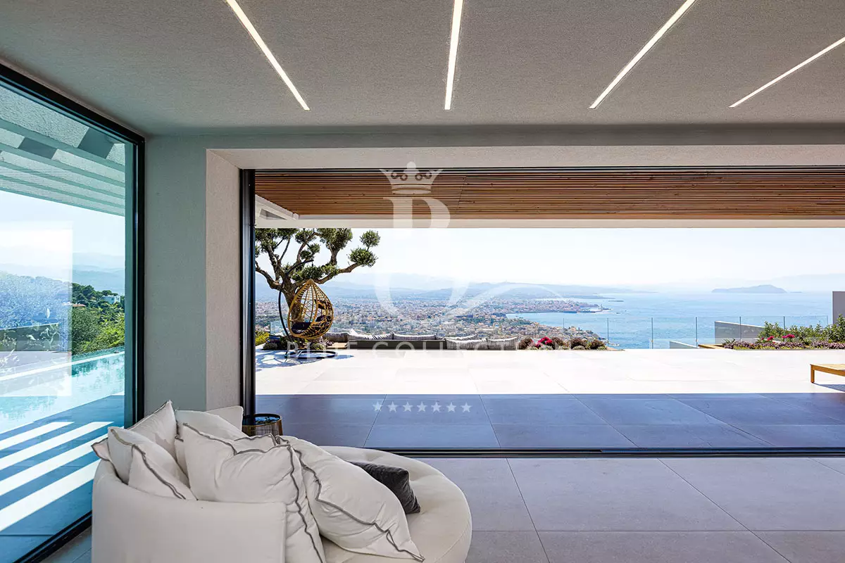 Floor to ceiling glazing wraps around this artfully simple, elegantly sophisticated, 4-tiered property, with its 2 large infinity pools taking prime position out on the terrace, amplifying views of the neighboring city and seascape.