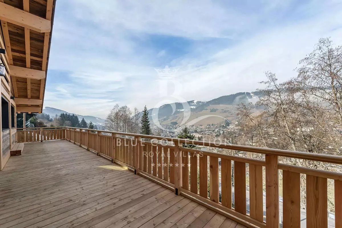 A large balcony surrounds this space to take advantage of the views over the Jaillet and the village of Megève.