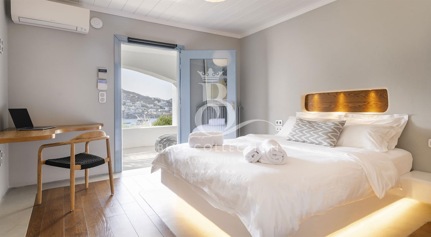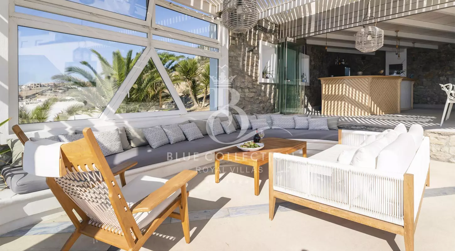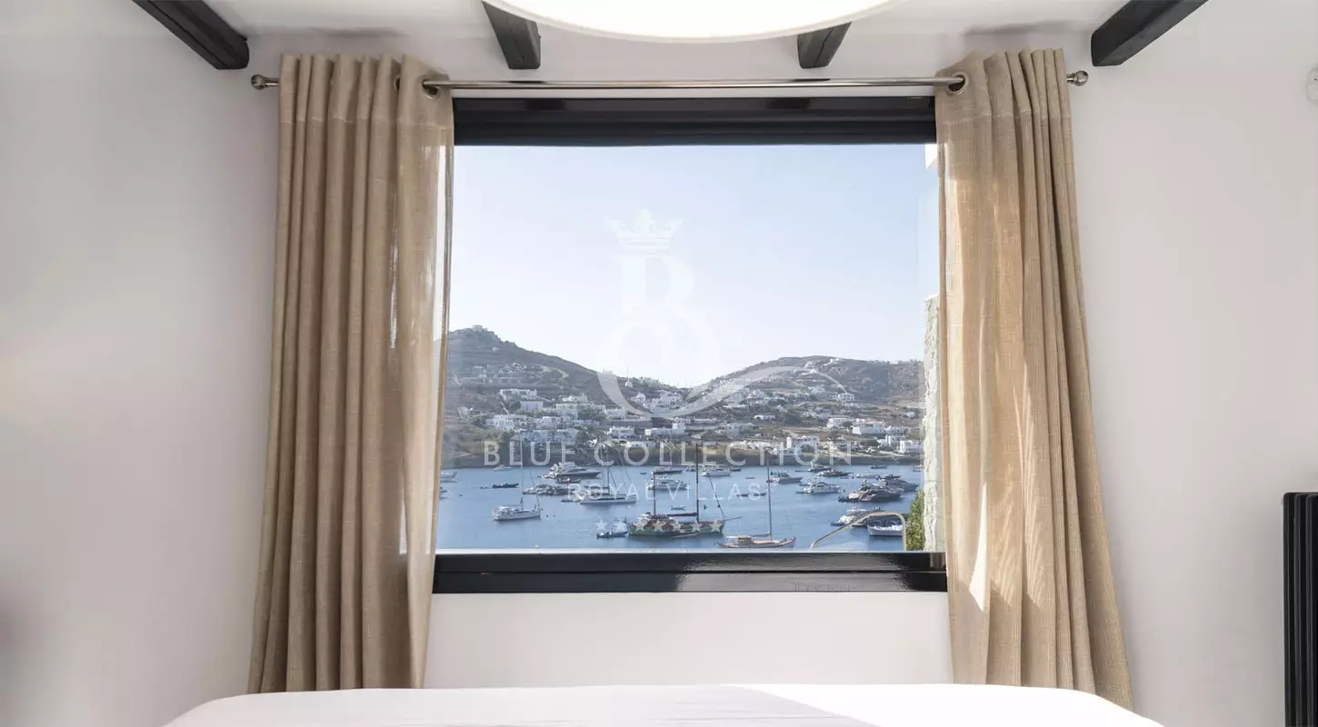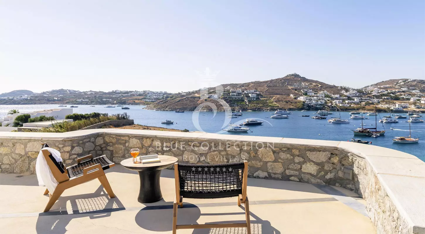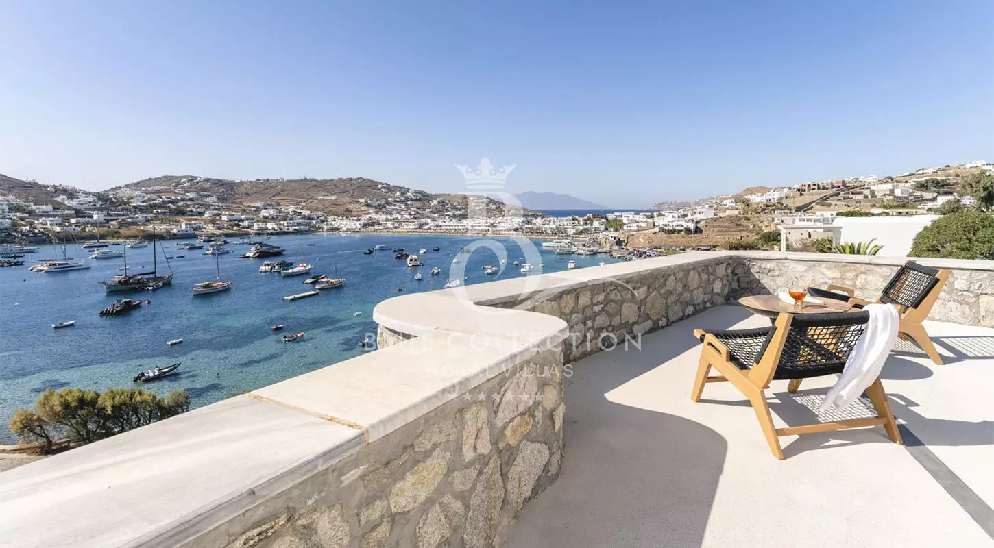 Perched on a prime spot overlooking the lively Ornos Bay, the Villa boasts stunning sea views and unparalleled access to the island’s vibrant charm.