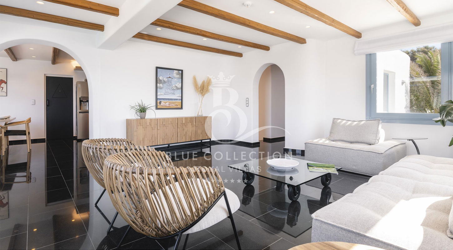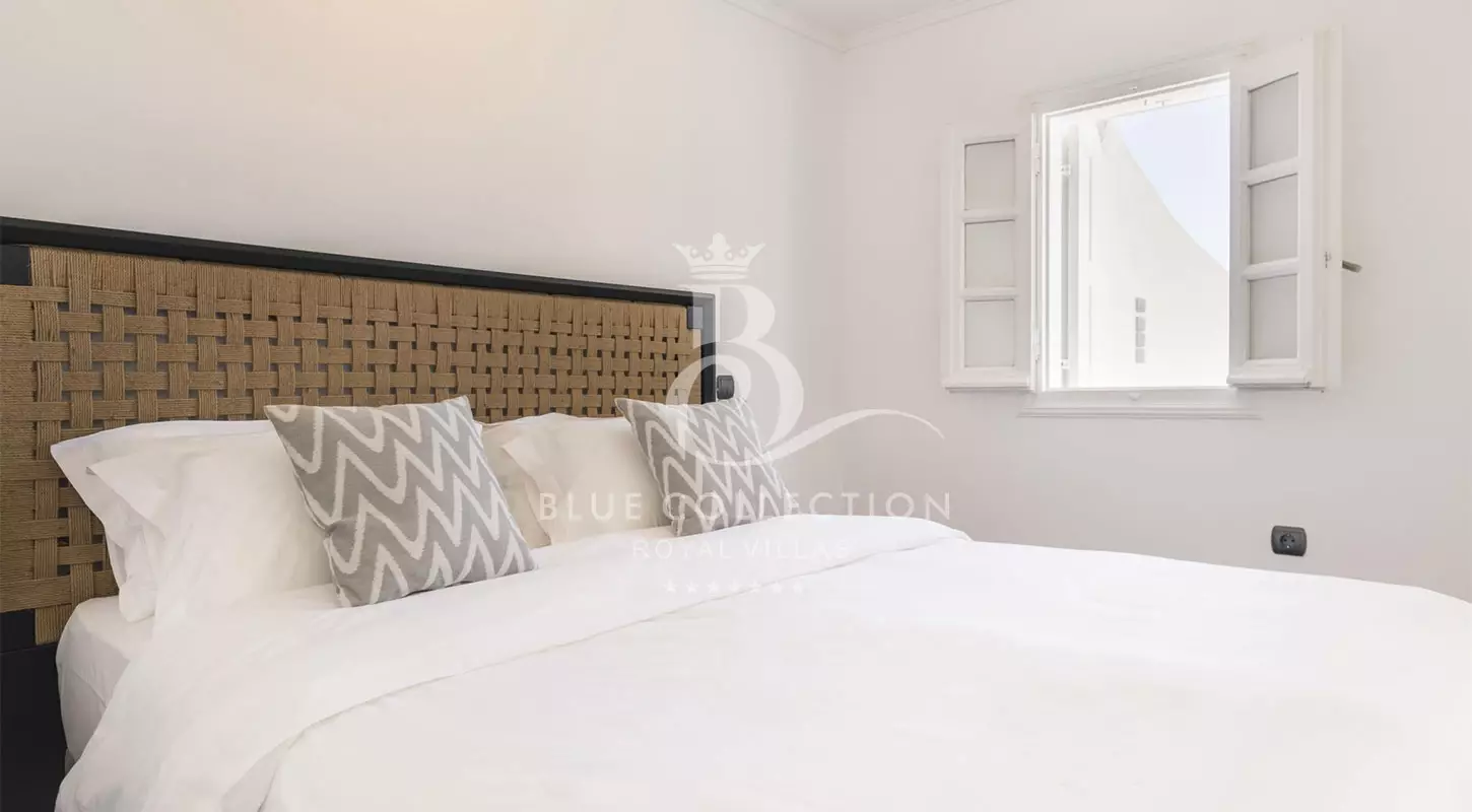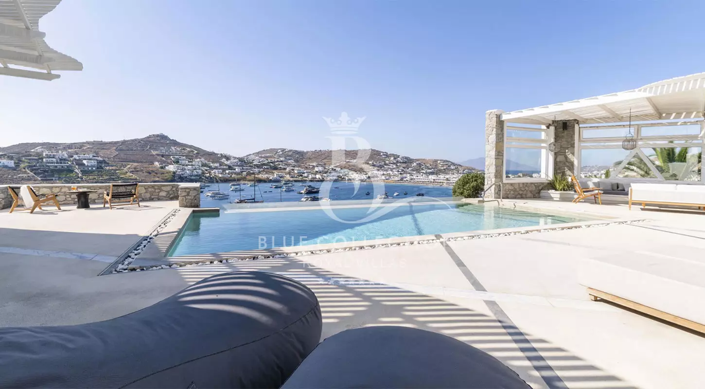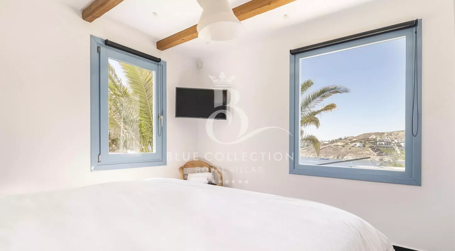 Perched on a prime spot overlooking the lively Ornos Bay, the Villa boasts stunning sea views and unparalleled access to the island’s vibrant charm.