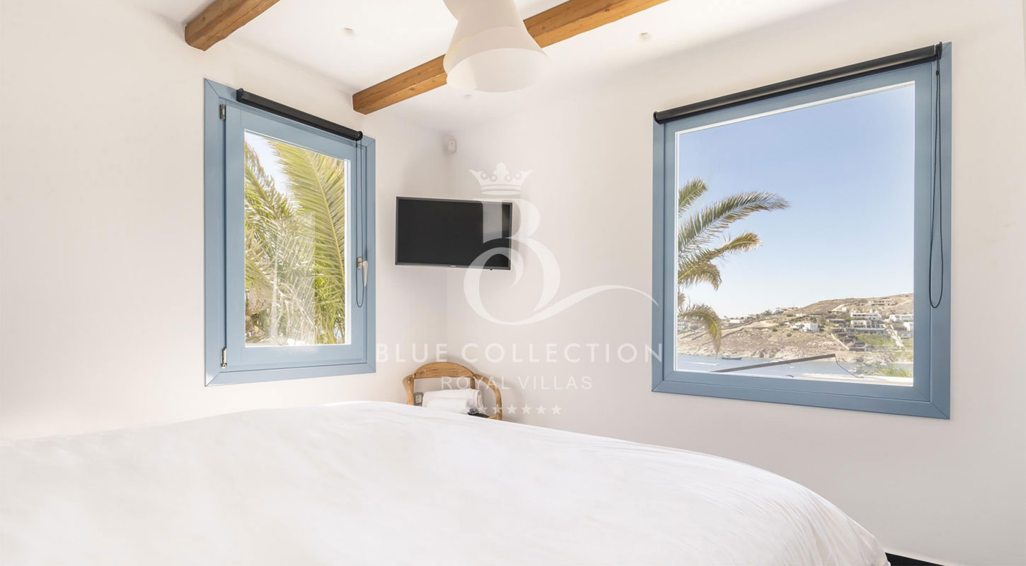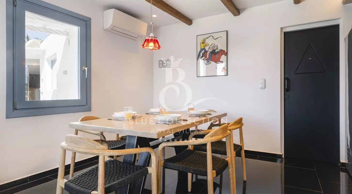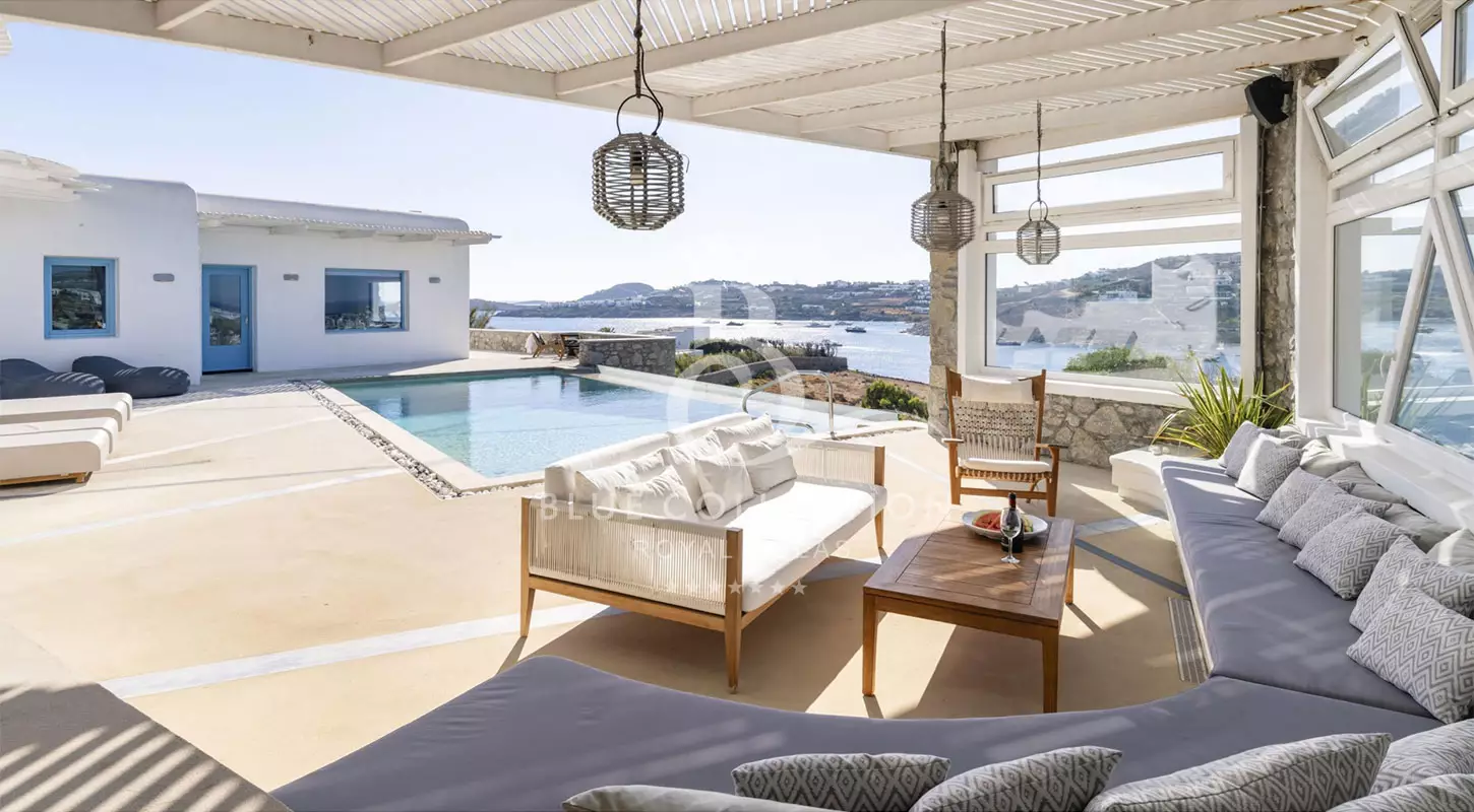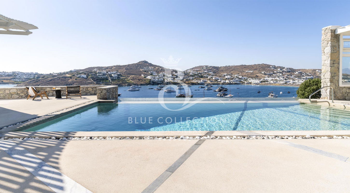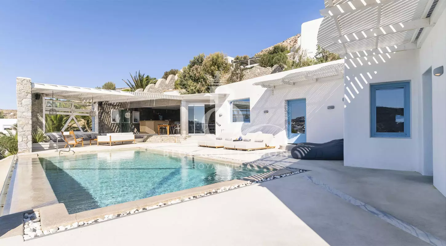 Perched on a prime spot overlooking the lively Ornos Bay, the Villa boasts stunning sea views and unparalleled access to the island’s vibrant charm.