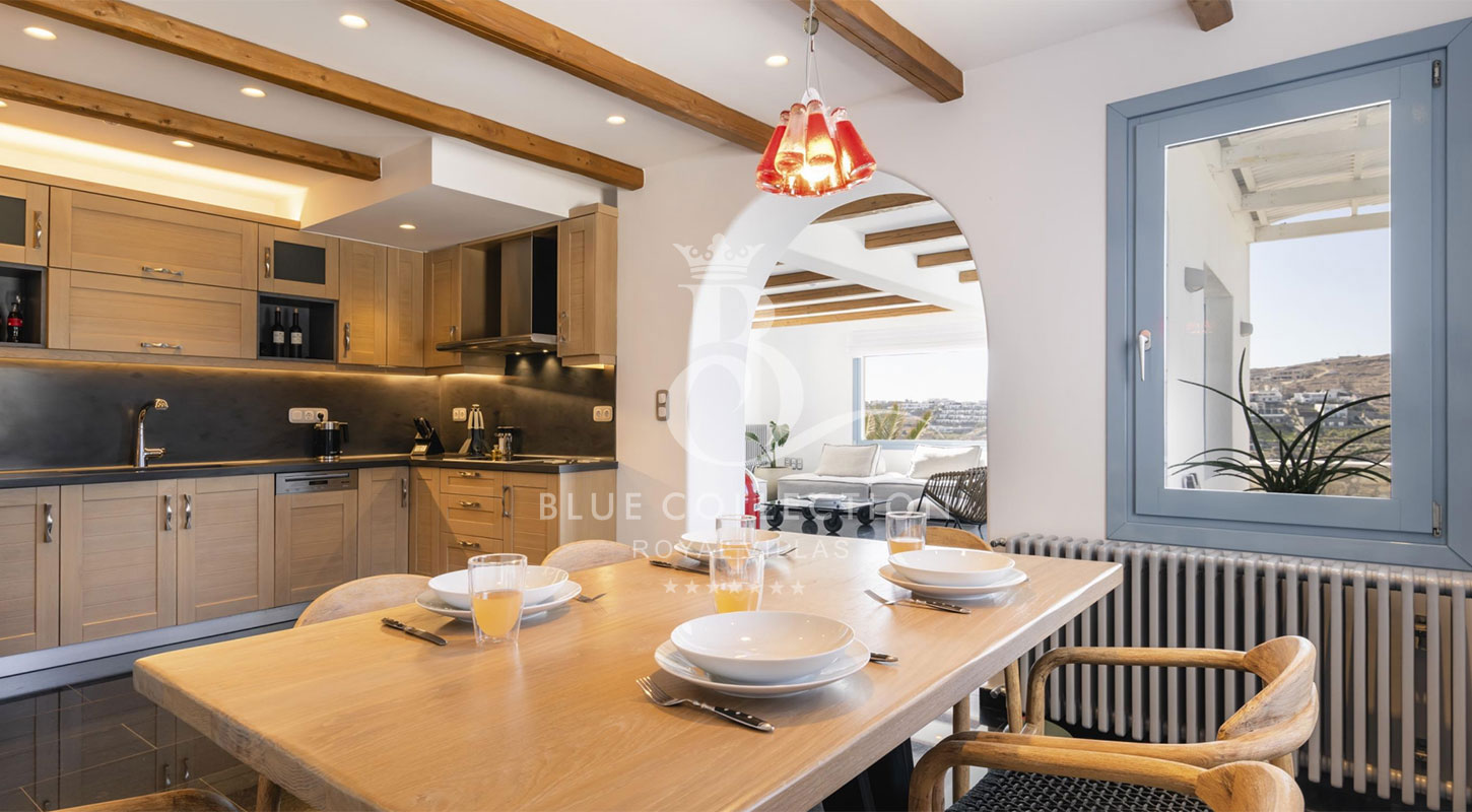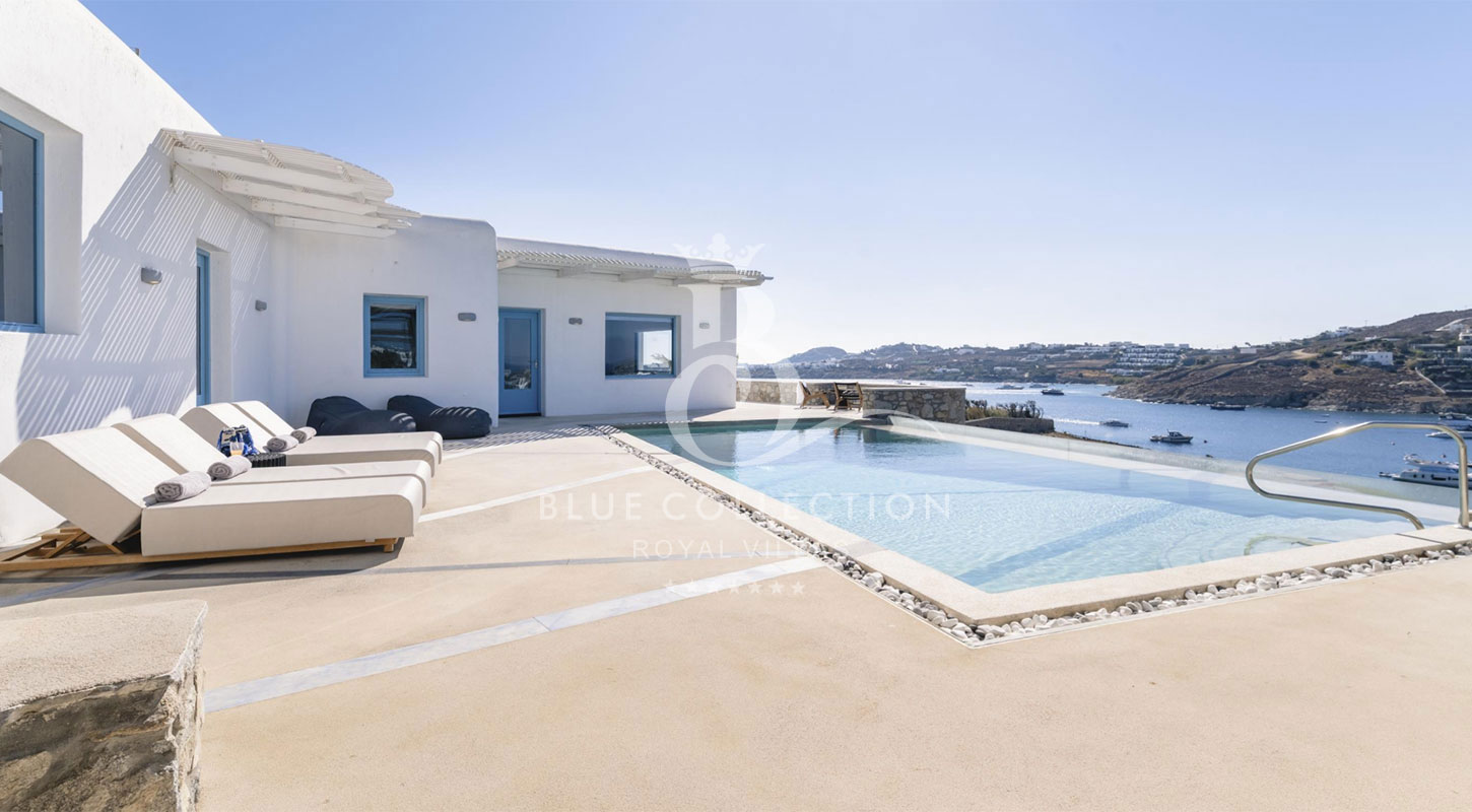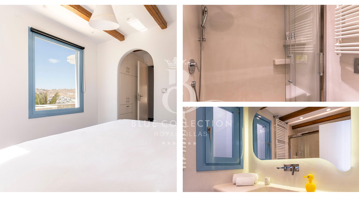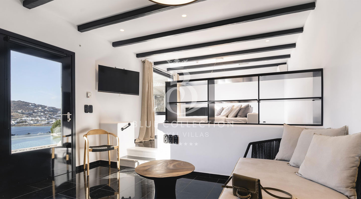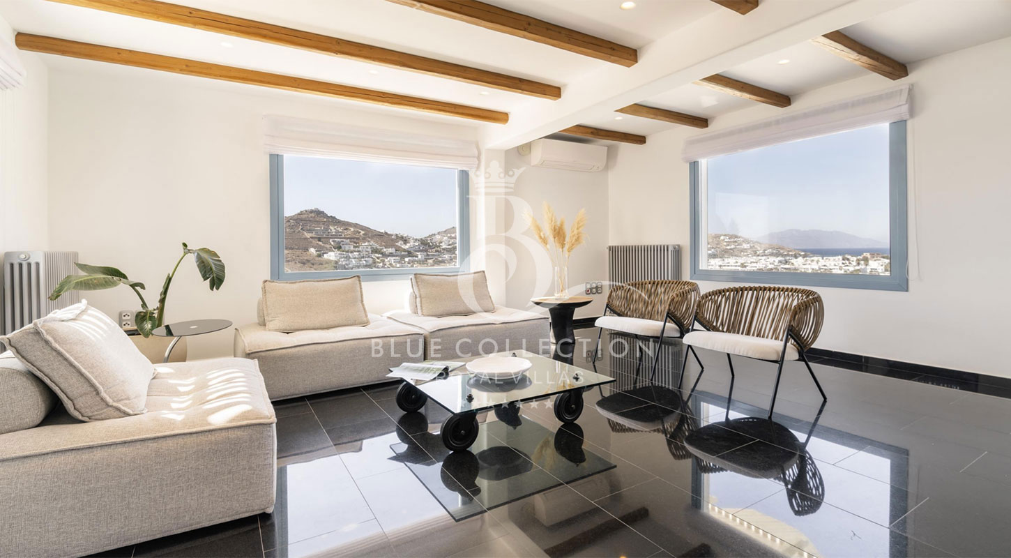 Perched on a prime spot overlooking the lively Ornos Bay, the Villa boasts stunning sea views and unparalleled access to the island’s vibrant charm.