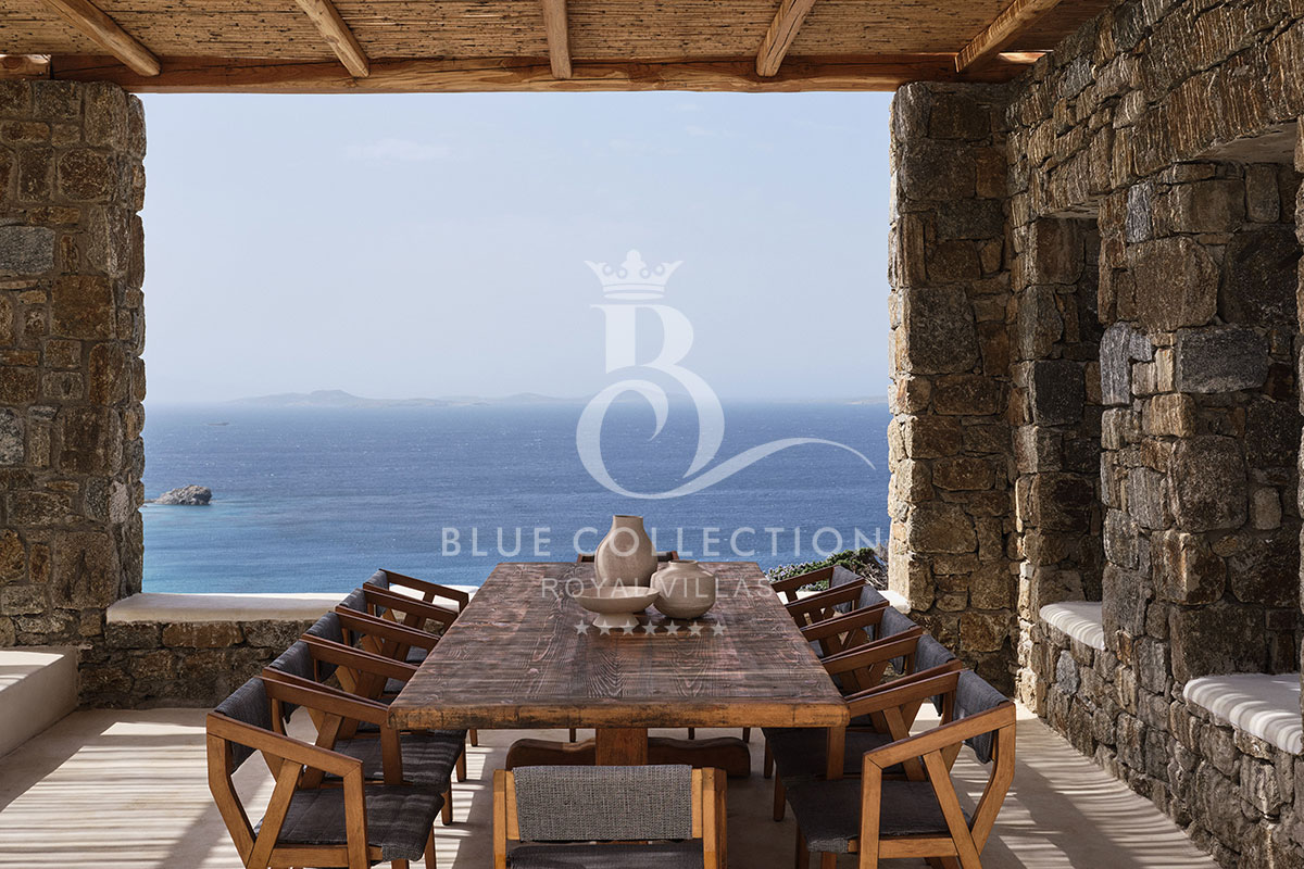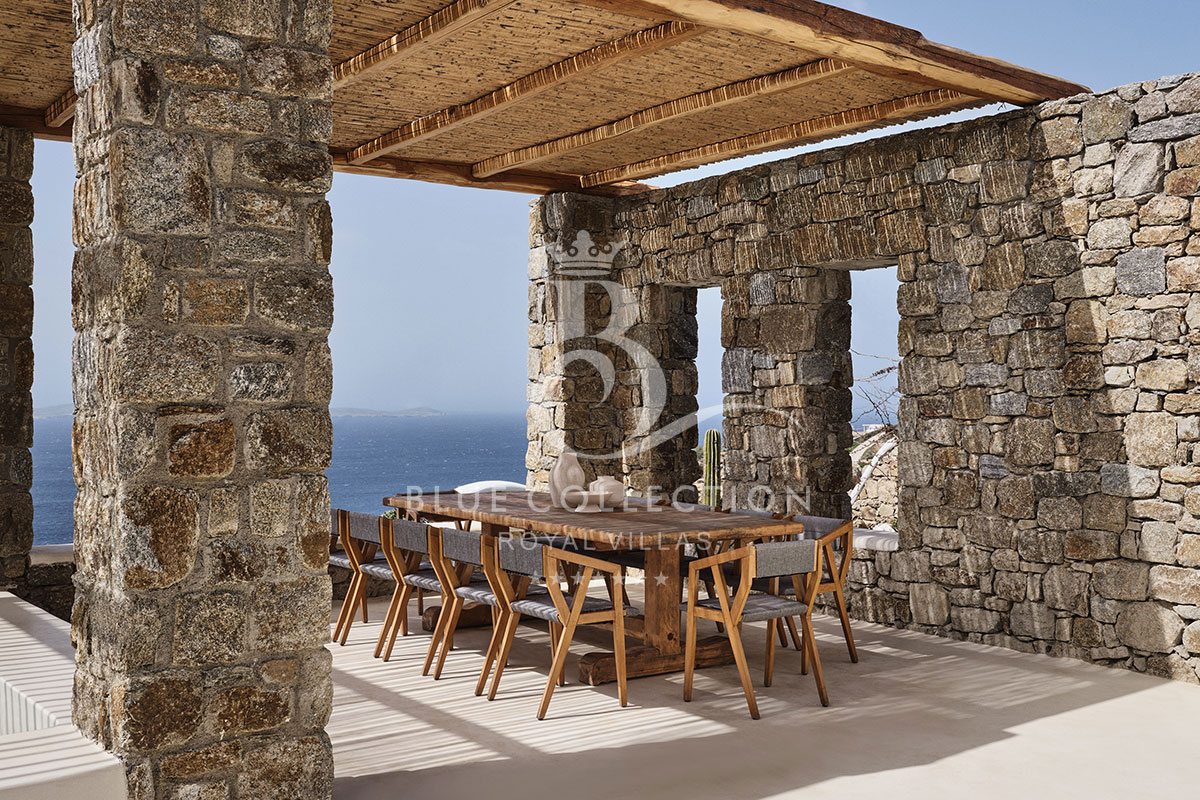 In Villa CHA-5 guests can savor the unobstructed sunset view, with the dusk colors and the sun diving in the horizon right in front of the pool. The stunning view of the ancient Delos & Rhenia islands, as well as of the neighboring Tinos Island is striking. The most impressive element of the Villa is the large infinity pool where guests can have a refreshing dip while relishing the wonderful view. The spacious exterior areas feature built-in sunbeds and lounges. A big pergola provides the perfect shade for the outdoor long monastery-style dining table and the open kitchen area, ideal for meals in the open Mykonos air or for BBQing on the premises. There is also a shower and WC by the pool for convenience.