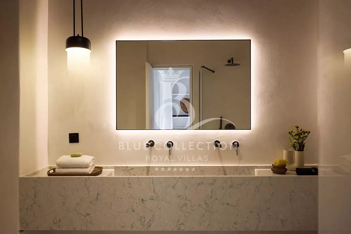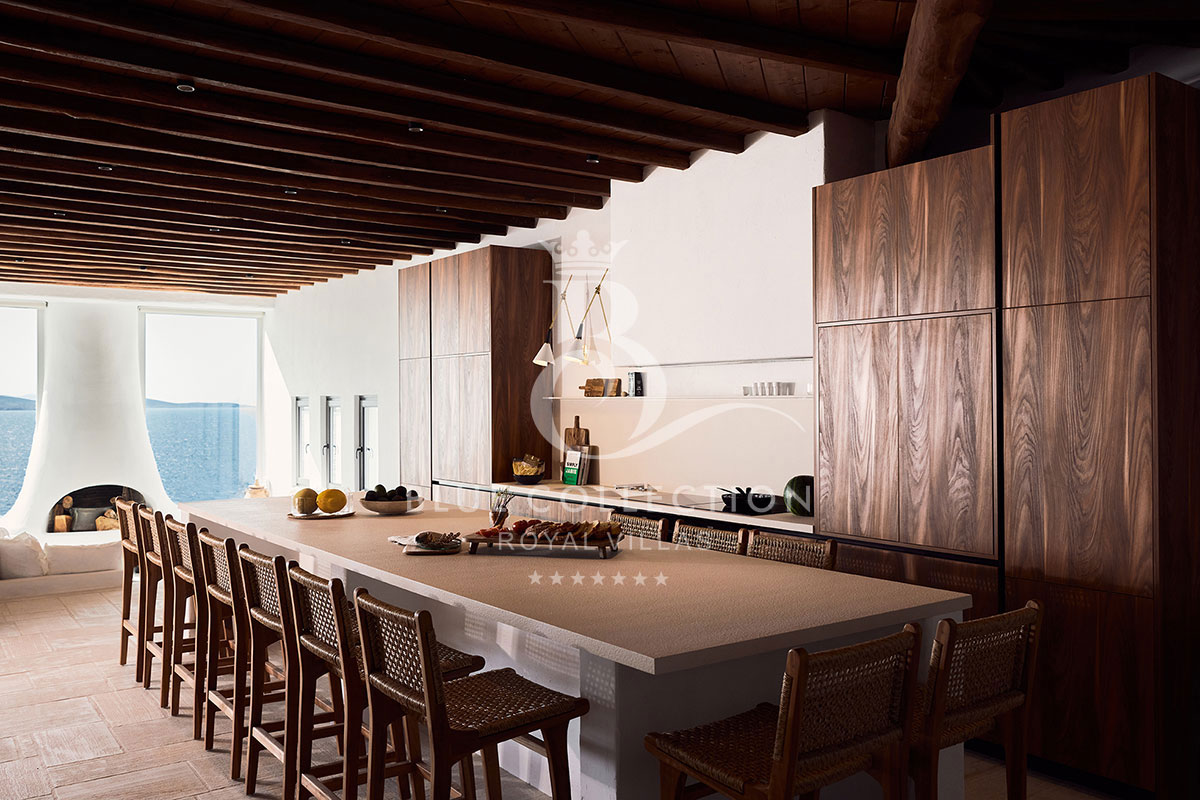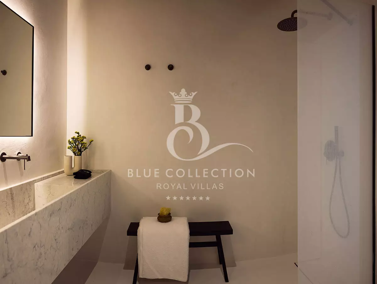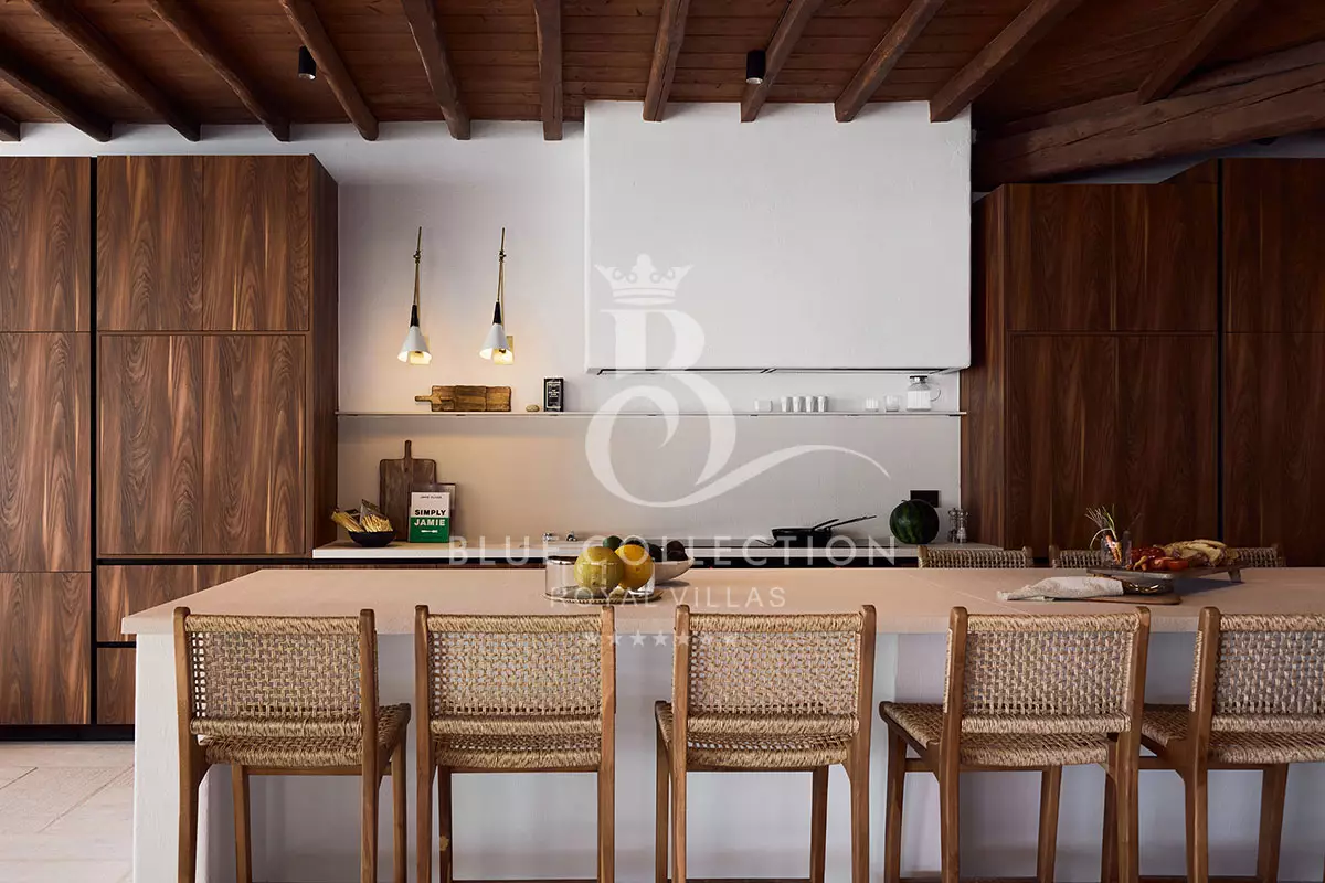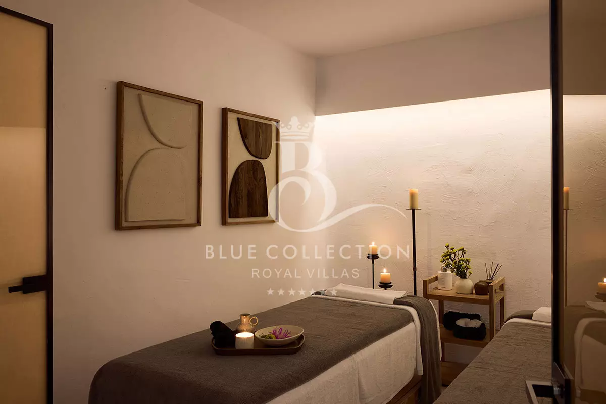 A sleek contemporary kitchen with a generous island flows effortlessly into the lounge and dining spaces, creating a seamless transition to the outdoor terraces. A dedicated massage room adds a spa-like feel, enhancing the Villa’s relaxing ambiance.