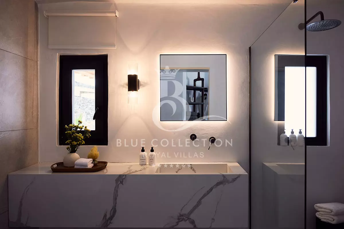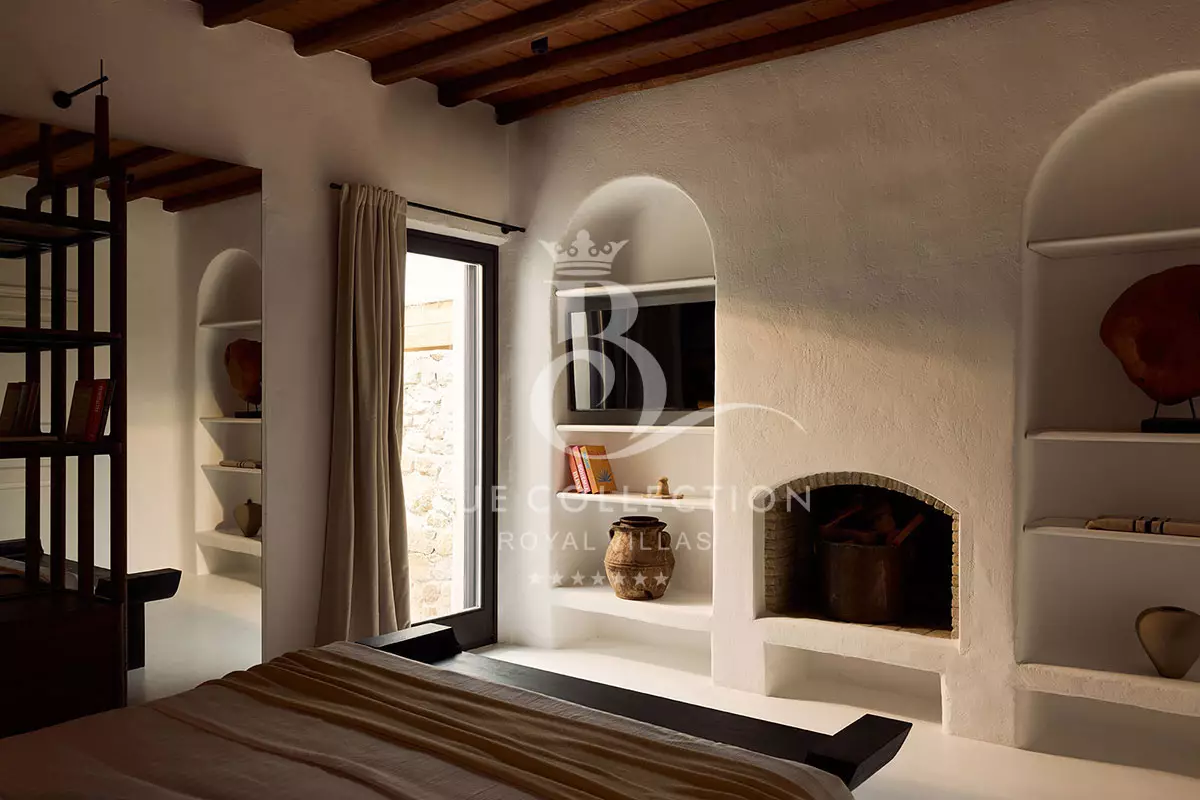 The outdoor areas are a true highlight—generous, beautifully landscaped, and designed for all-day enjoyment. The kidney-shaped heated pool, shaded terraces, and comfortable lounge corners invite long hours under the Aegean sun or relaxed evenings with sunset views.