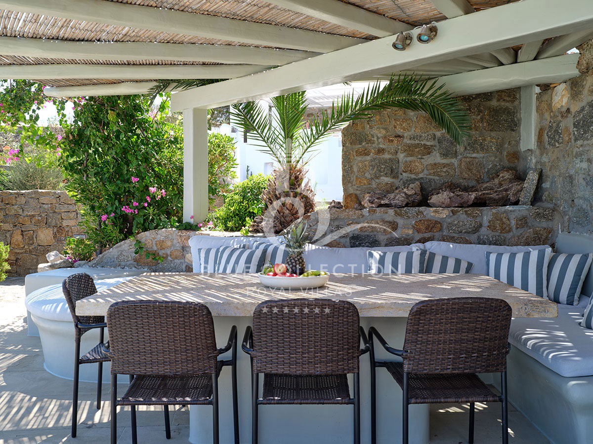 Numerous pergola-shaded lounging areas with stone built sofas along with its al fresco dining setting right by the barbeque complement the absolute summer bliss offered by this Villa.