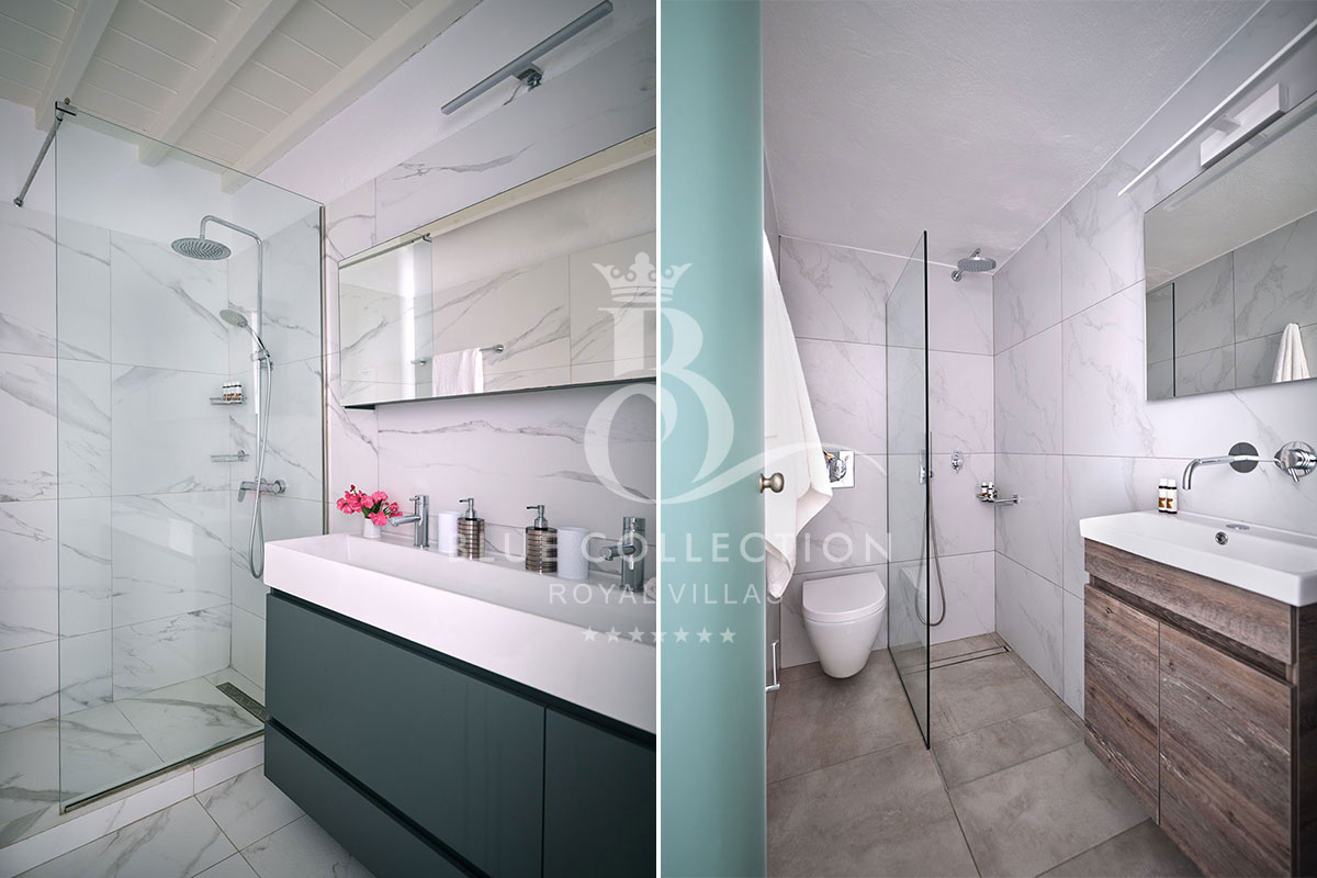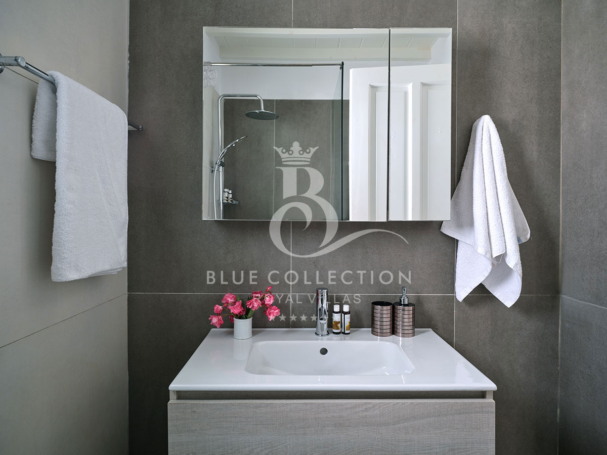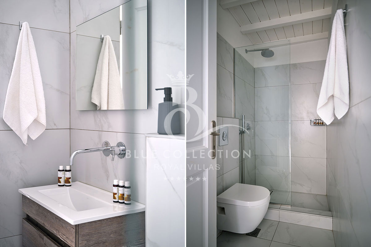The pool level of the Villa hosts the rest of the sleeping quarters of the property with a charming master en-suite bedroom, a double one with en-suite shower and a children’s room with bunk beds and shower.