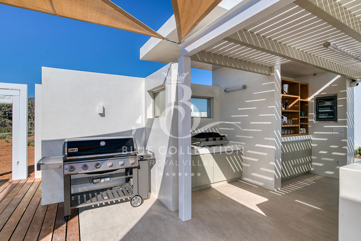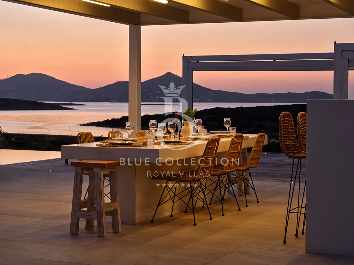 Apart from the ample interior spaces, this exclusive Villa in Paros also offers extended outdoor living spaces. A large infinity pool with sun loungers on a wooden pool deck at the rim of the property, a pergola-shaded sizeable lounging area, a separate dining area with barbeque and an outdoor bar will dress your days and nights in the most stunning views of the rugged coastline around the property.