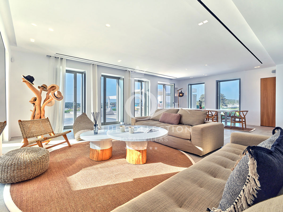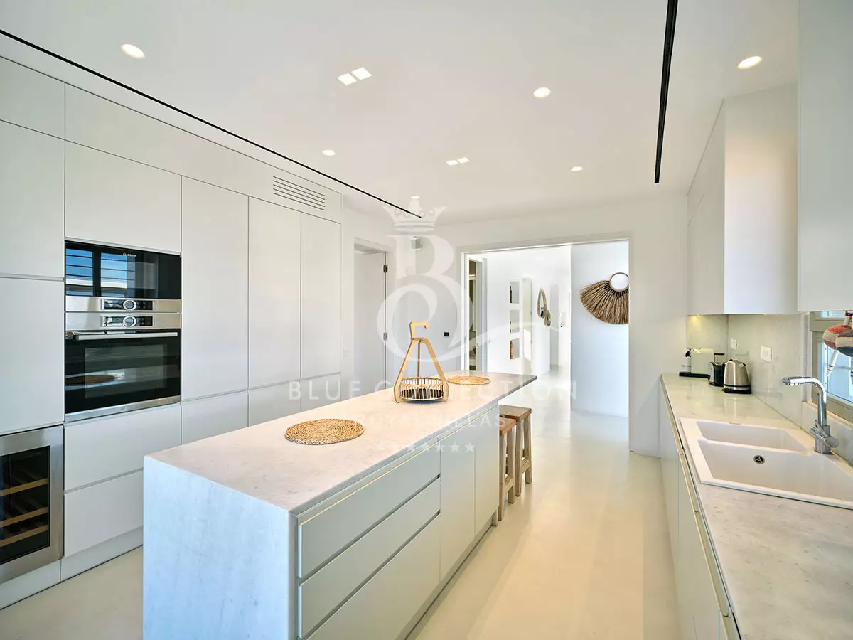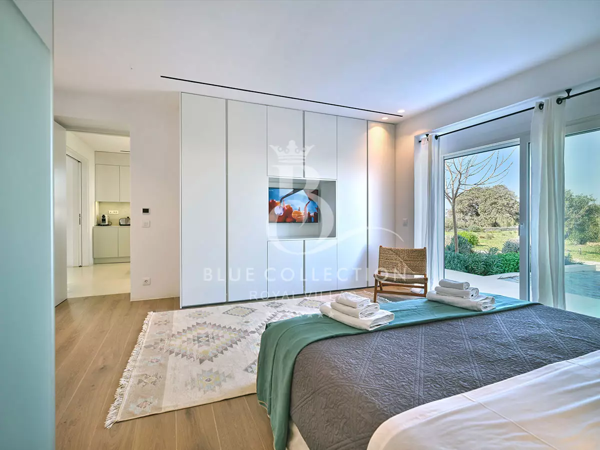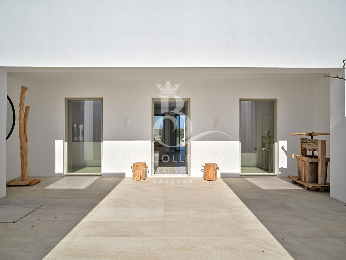 Overall, Villa PRS-44 is minimal and modern, with simple lines and cubic formations that reveal its Cycladic origin; inside, the rooms are large and full of natural light. The smartly-appointed large windows drench the house with soothing sun rays and uninterrupted sea views, and the vast plains encircle the residence. Decorated in white and light beige hues, with tiled floors and marble bathrooms, the Villa’s interiors all exude a sense of purity and liberty that will reinvigorate your body and mind.