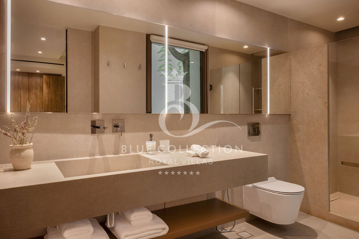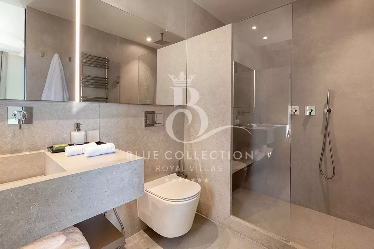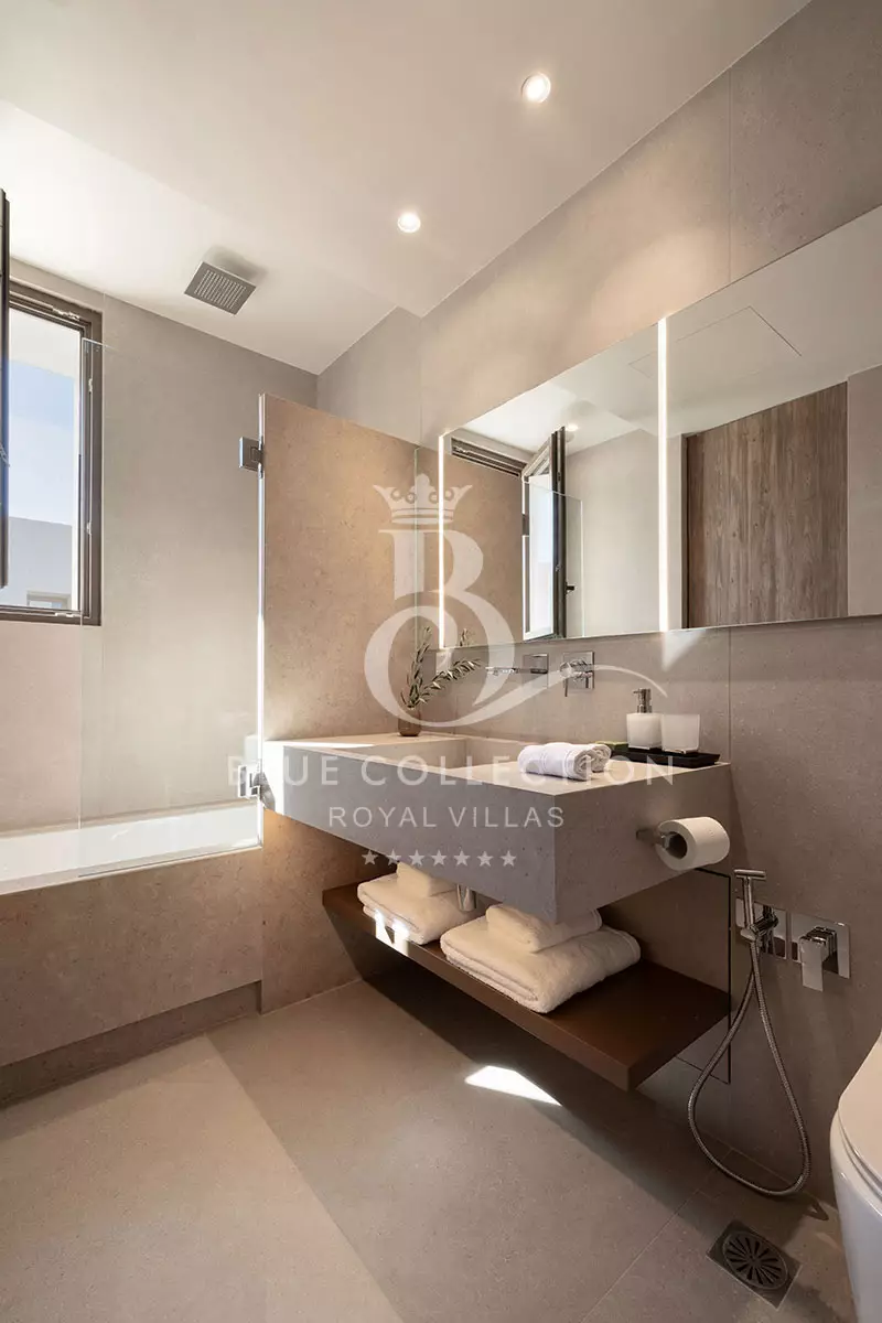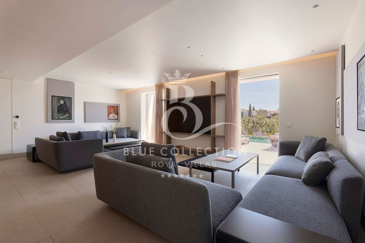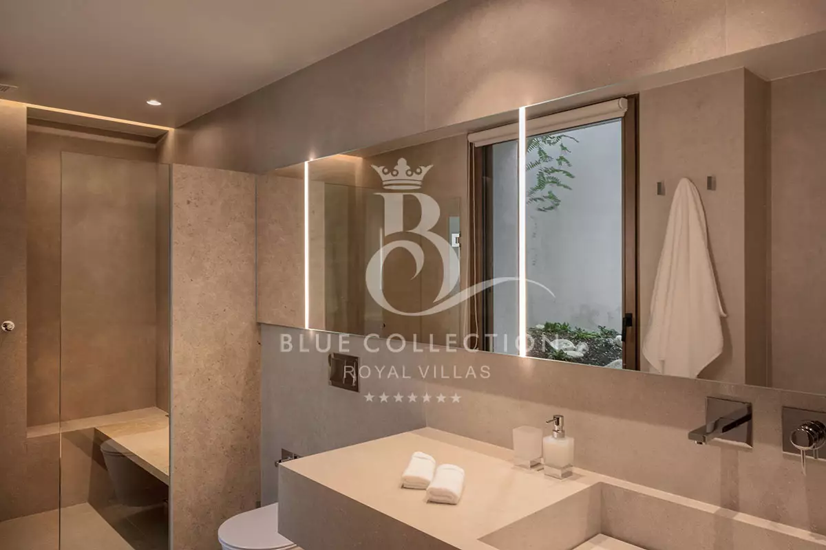 Nestled within a lush private garden, it features a 90 sq.m. swimming pool with jacuzzi and a children’s section, creating an oasis for relaxation and family enjoyment.