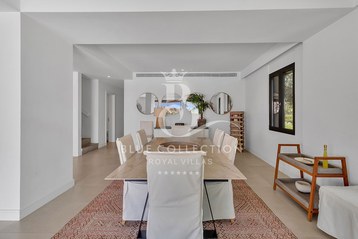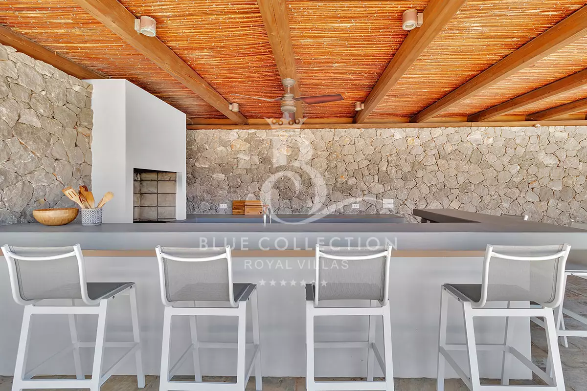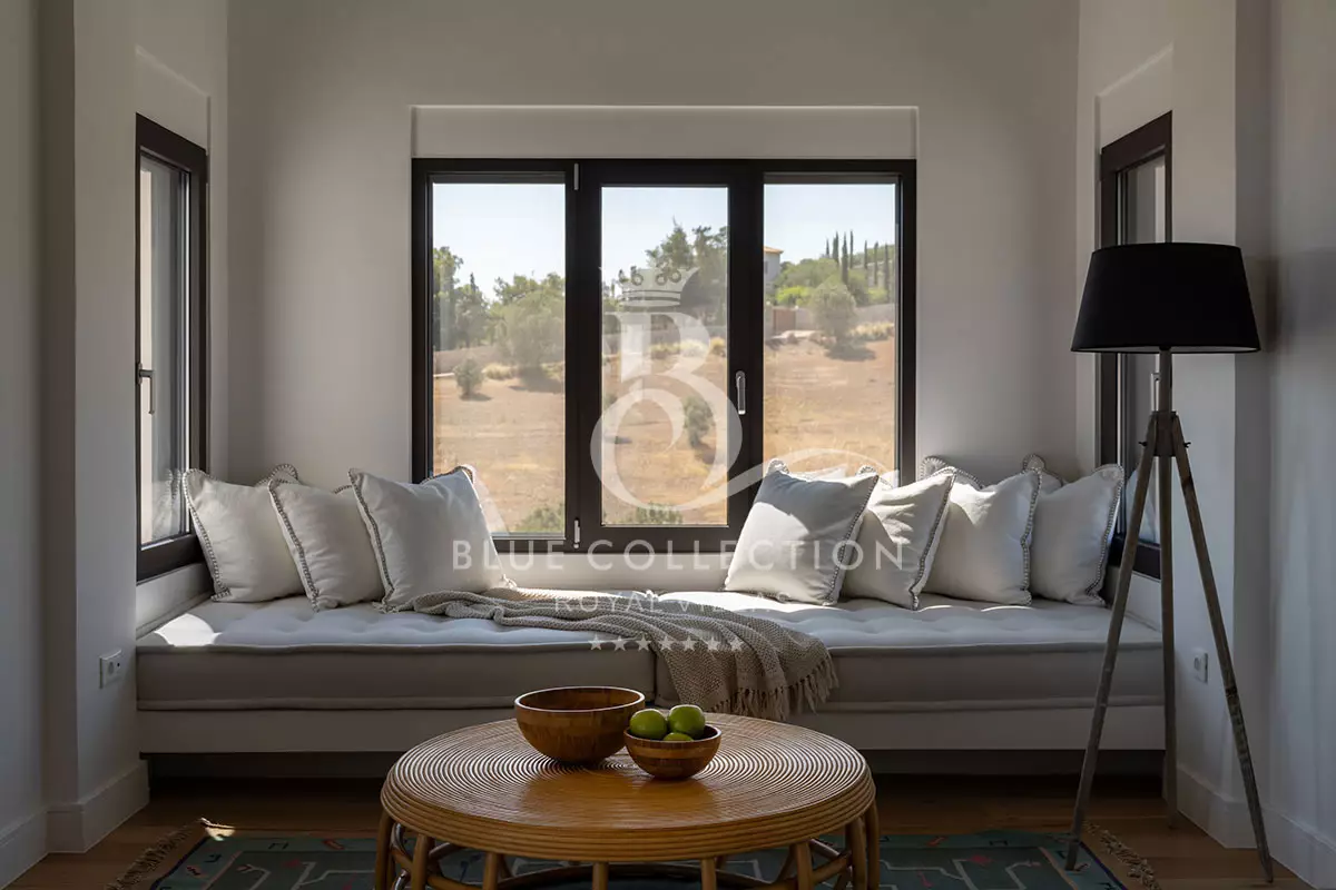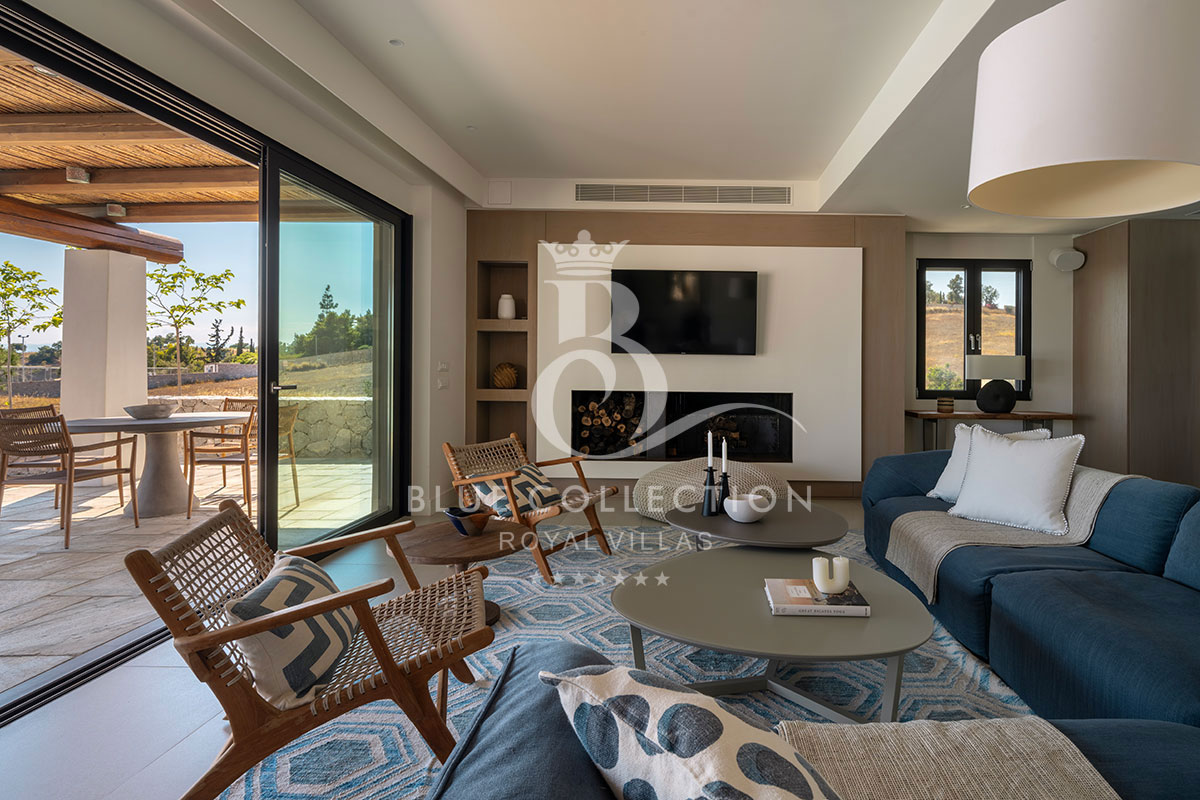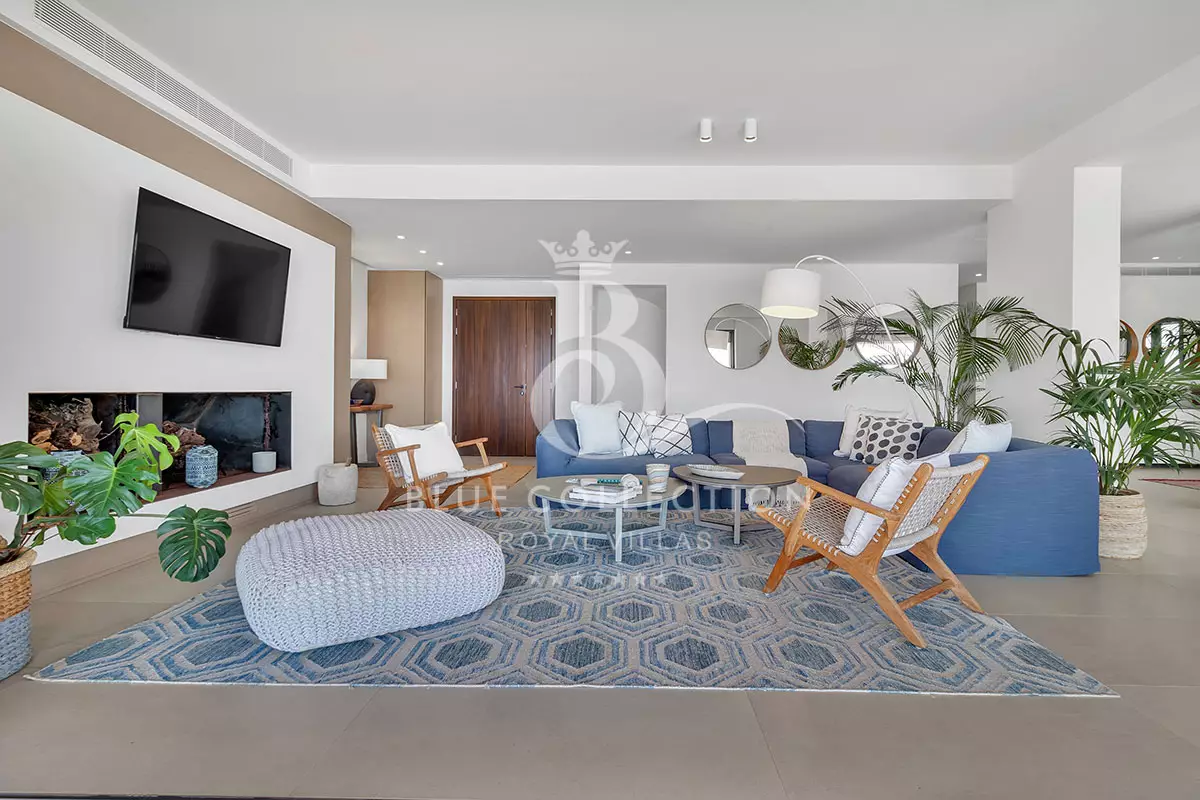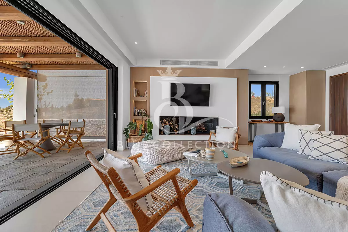 As you step inside the Villa, the ground floor welcomes you with a bright and inviting living room featuring a cozy fireplace and expansive windows that open onto a panoramic terrace.