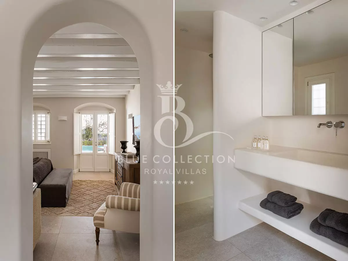 SNT-1 blends the modern aesthetics of the Cycladic style with the timeless elements of stone and wood, creating a heavenly rustic landscape. Cobbled pathways lined with olive trees guide you to the whitewashed villa, seamlessly harmonized with Santorini’s iconic atmosphere. Passing through the grand wooden doors, reminiscent of a castle entrance, you step into your own private paradise. The dreamy pool area, furnished with elegant sunbeds and shaded lounge spots, overlooks the tranquil Aegean Sea. Outdoors, you will find inviting lounge and dining spaces ideal for relaxation. At sunrise, step outside to witness the sky transform with breathtaking colors, offering a truly unique and euphoric experience.