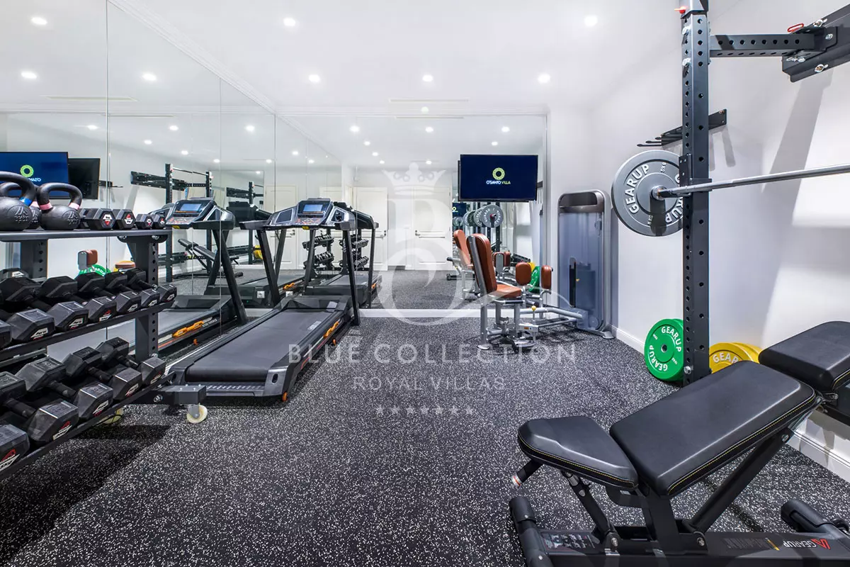 From the upper level’s private terrace, you can soak in spectacular sea views, while the main level invites you to unwind in serene lounging and dining areas. The lower level not only offers a dazzling private pool but also a fully equipped gym, allowing you to continue your fitness routine during your stay.
