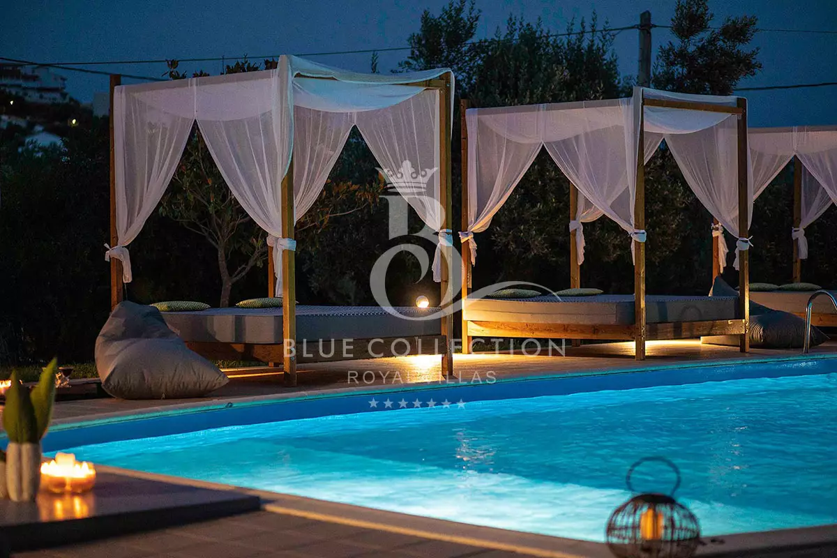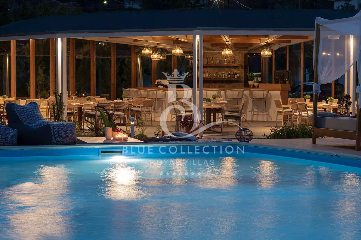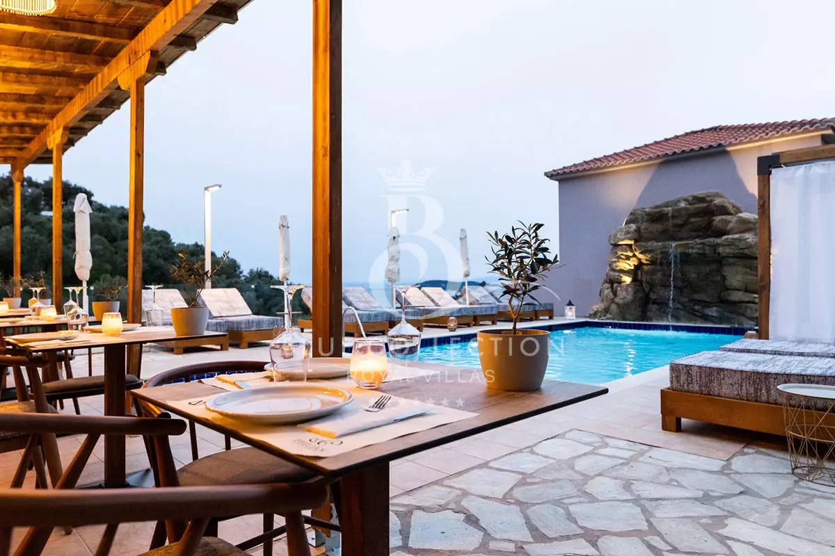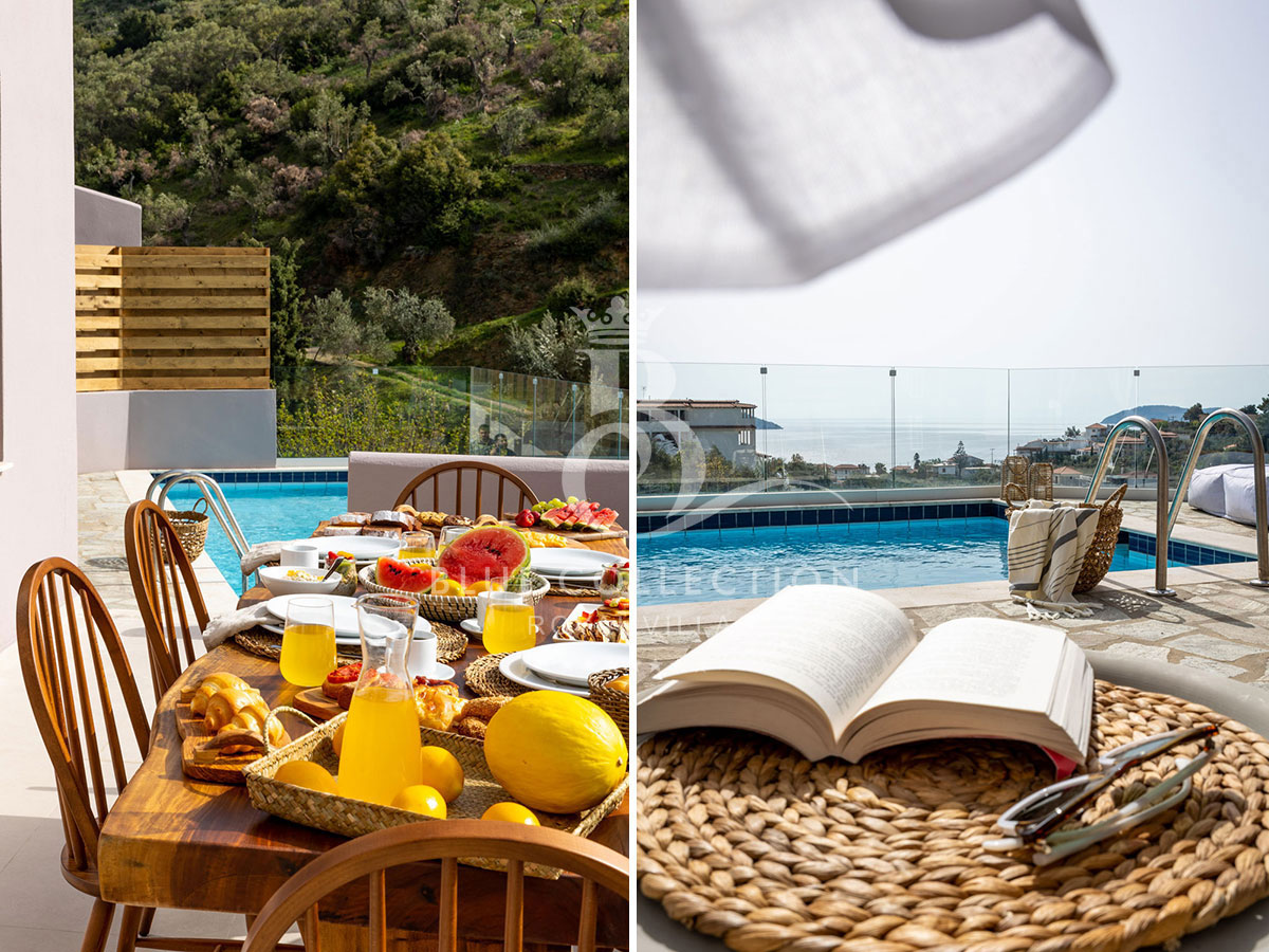 This Villa for Rent in Skiathos, seductively awakens all senses as you move from the unparalleled indoor comforts to private poolside pleasures, overlooking the infinite blue of the Aegean Sea